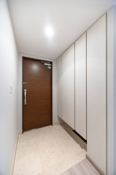 自動点灯式の照明が付いていて、いつも明るく出迎えてくれる玄関。荷物で両手が塞がっている時や夜遅く帰宅した時に、スイッチを探す手間がかからず助かります。シューズボックスは天井まで高さがあり、収納力◎。靴はもちろん、傘などもすっきり収納できます。
