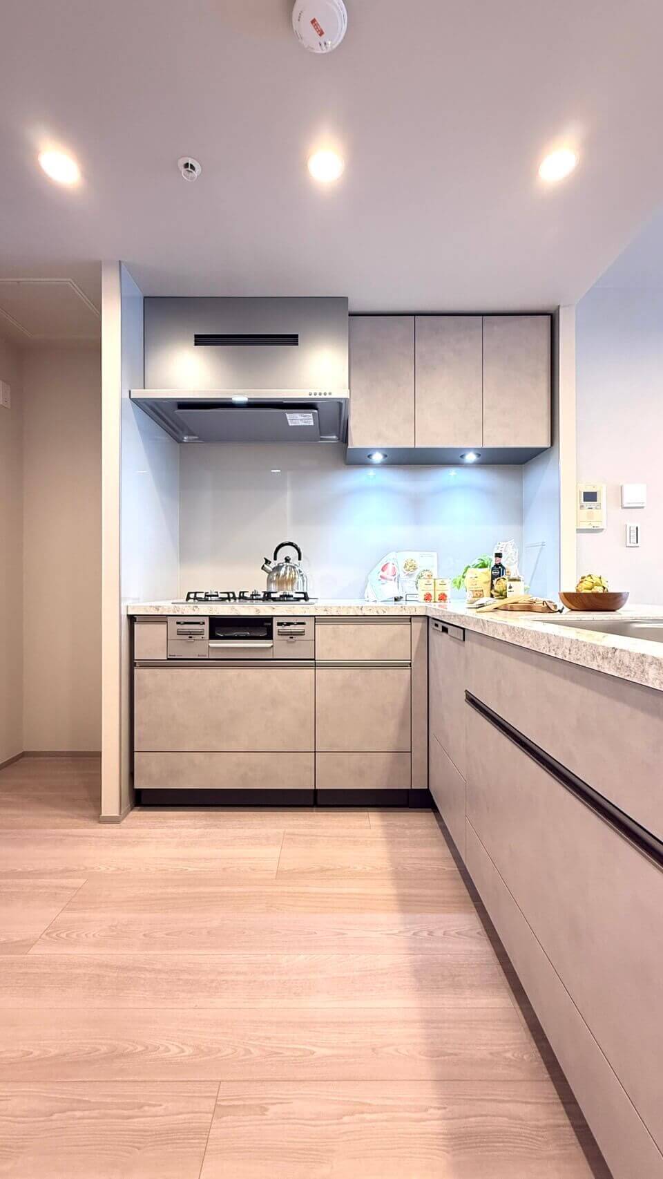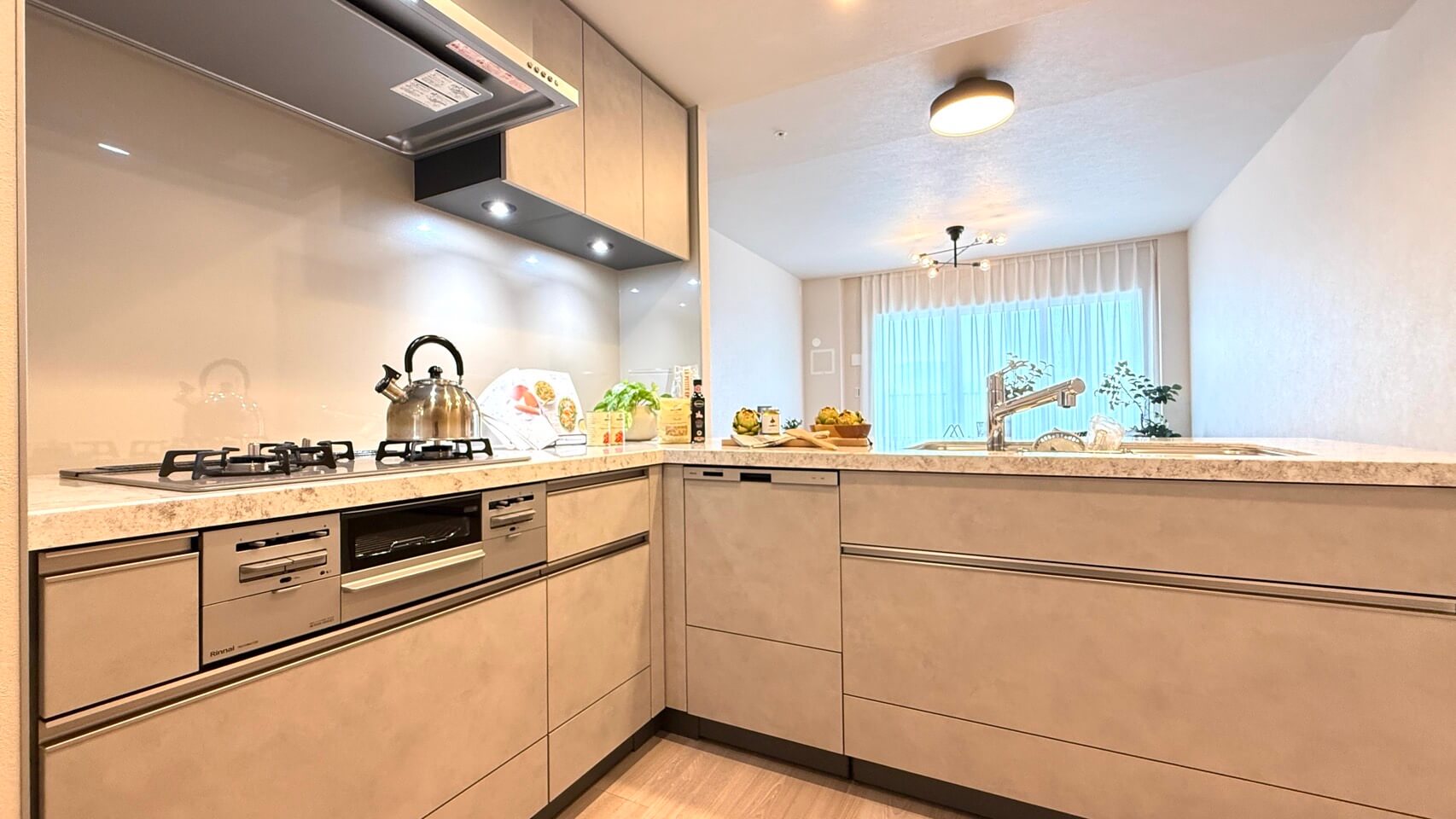 調理スペース広々のL字型のシステムキッチン。シンク側はリビングと対面しており、家族やゲストとコミュニケーションが取りやすくなっています。料理が捗る3口ガスコンロ、家事の時短に心強い食洗機、生ゴミの処理に便利なディスポーザー付きで設備も充実しています。
