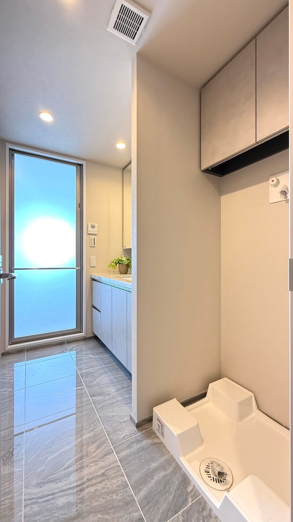 天然石調のカウンターで重厚感と上質な雰囲気がある洗面化粧台。洗面まわりの小物がすっきり整頓できるミラーボックス付きで、いつでも整った状態をキープできそうです。大容量のリネン庫も備わっています。