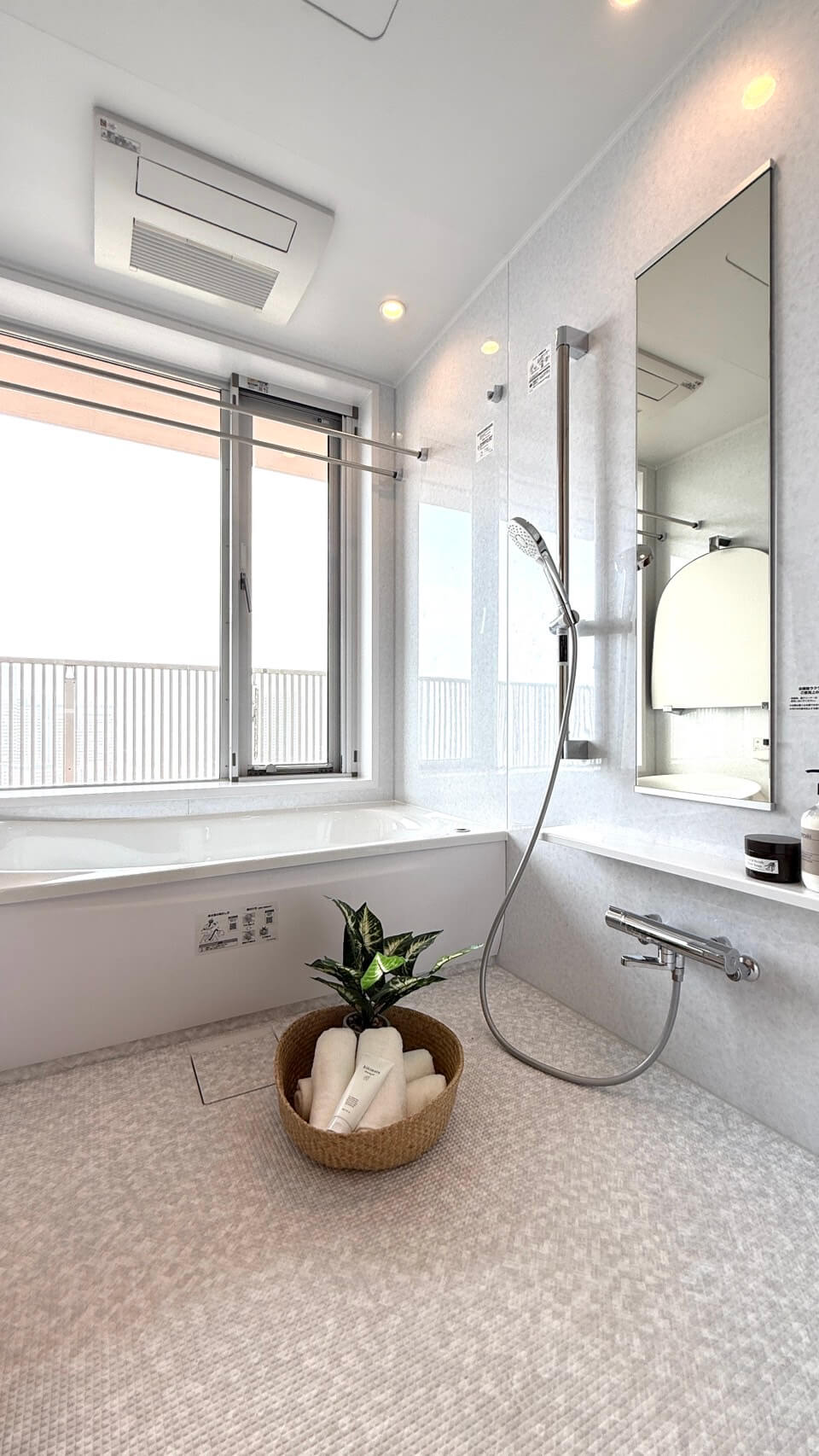 大きな窓で開放的なバスルーム。1620サイズのゆとりある広さです。窓はバルコニーに面しています。浴室換気乾燥機とランドリーパイプ2本付きで、雨の日や冬場の洗濯にも困りません。