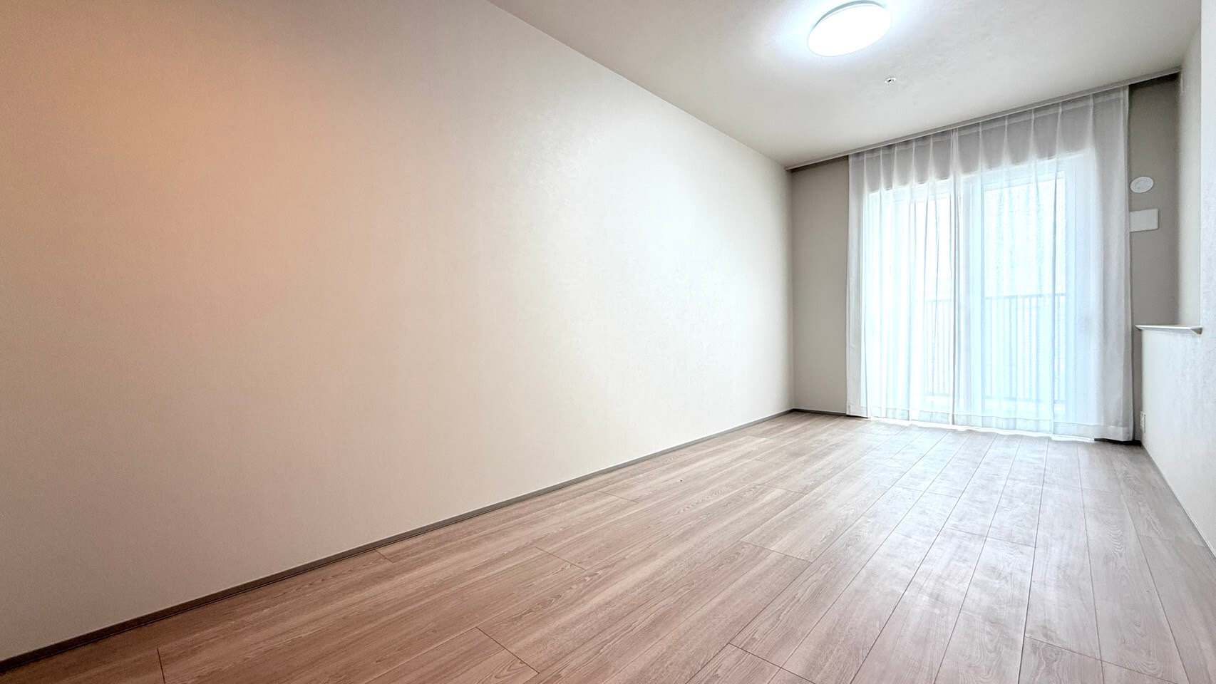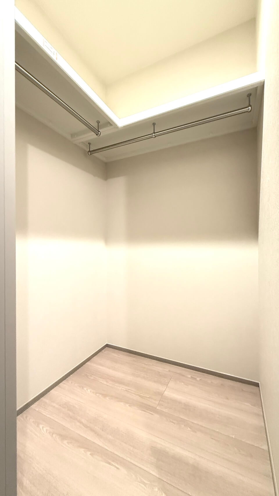 約9.0帖の洋室1。廊下に面した独立性の高い空間で、自分時間をゆっくりと過ごせます。こちらも夕方まで明るさが続く西向きで、バルコニーへの出入りも可能です。また、3方向にハンガーパイプが付いたWIC(ウォークインクローゼット)も備わっています。