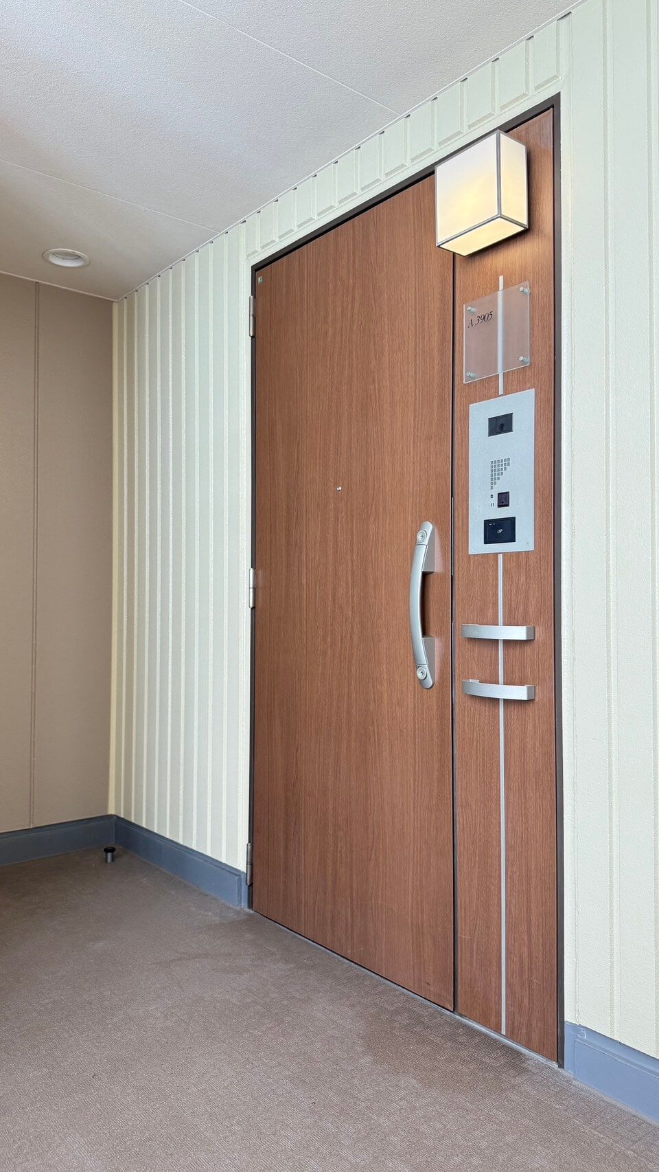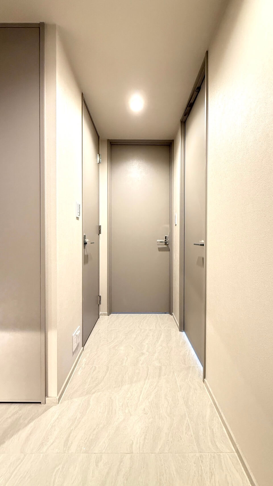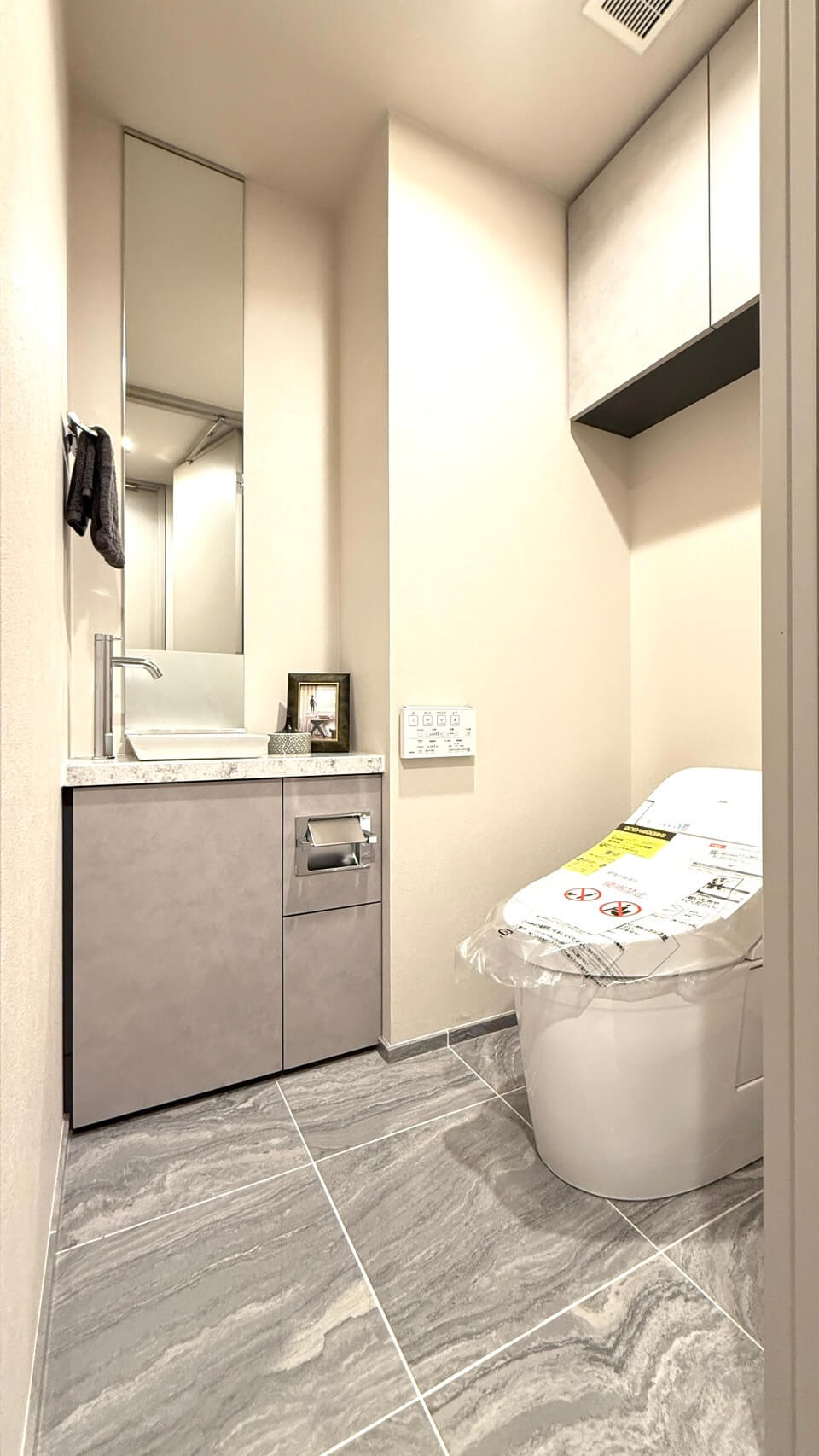 廊下に面したレストルーム。空間がすっきり見えるタンクレストイレです。手洗いカウンター、ウォシュレット、収納スペース付きです。