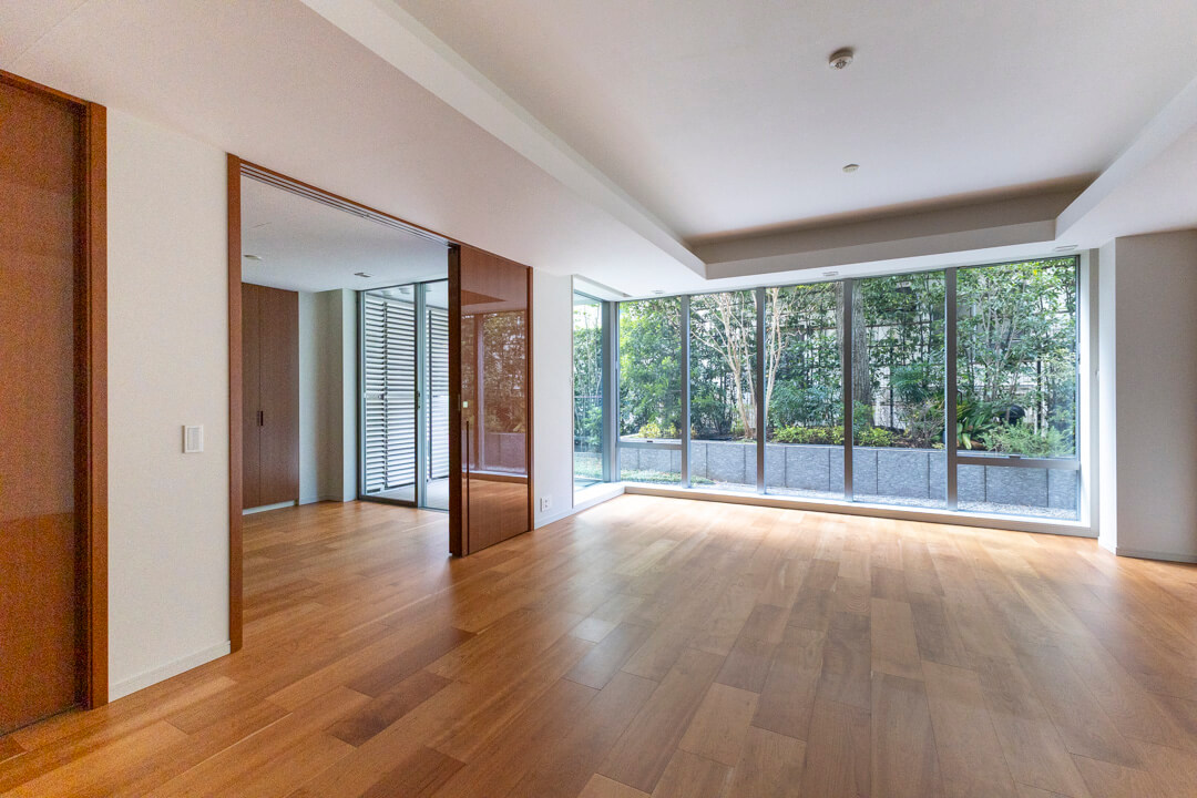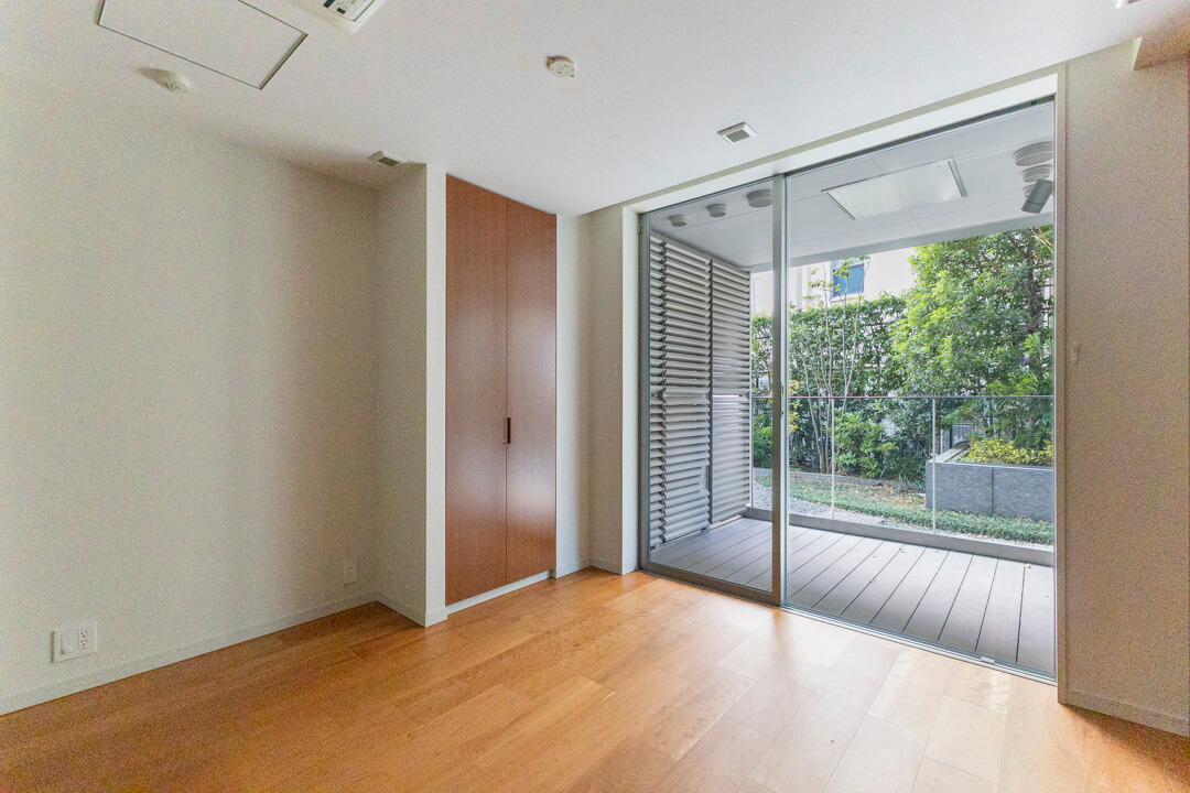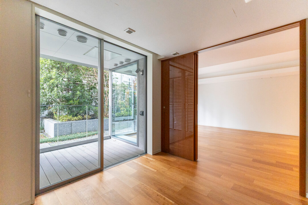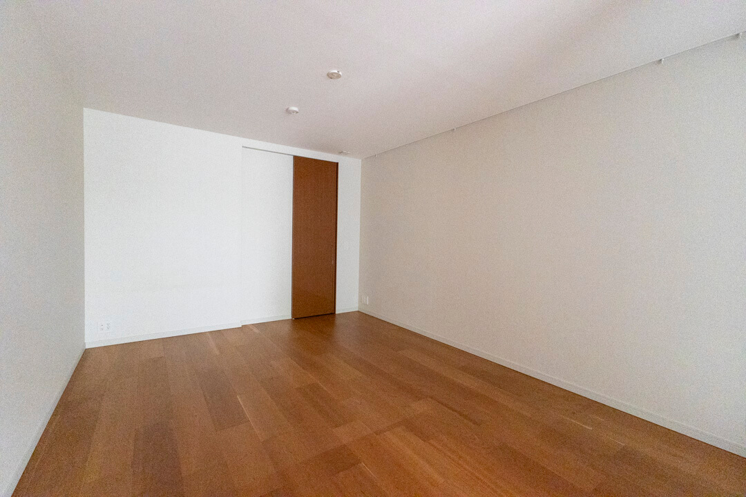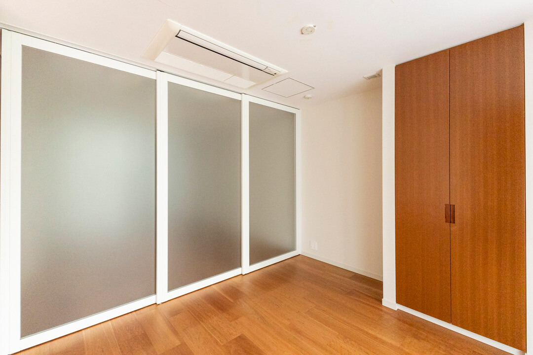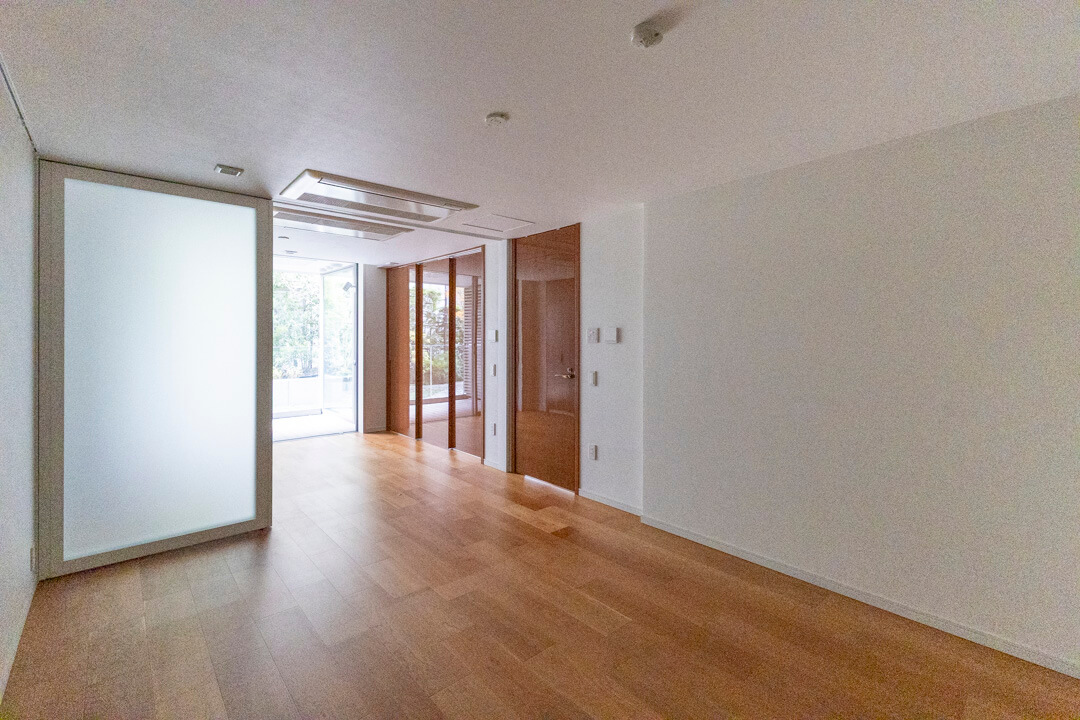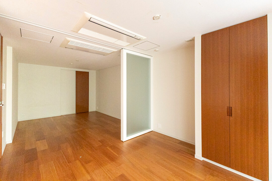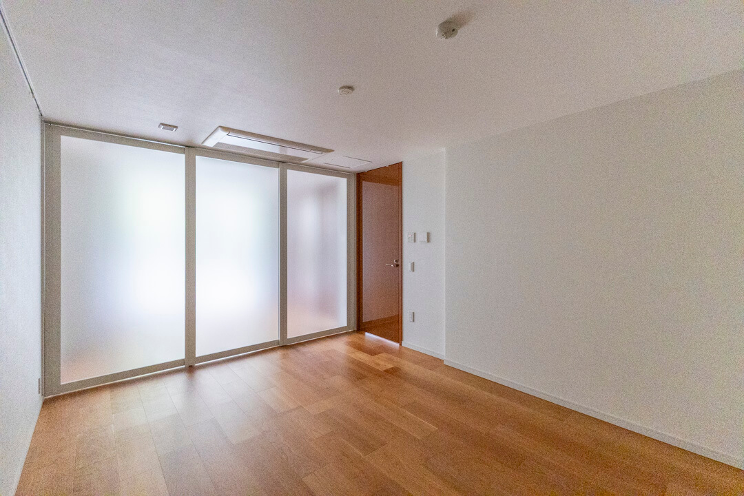 約9.6帖の洋室1。ゆとりある広さで主寝室にぴったりです。隣接する洋室との間仕切りにはガラス引き戸を採用し、バルコニーからの光を取り込みます。引き戸を開ければ、2部屋をつなげて広々と使うこともできますよ。こちらのお部屋にも床暖房が敷設されています。
