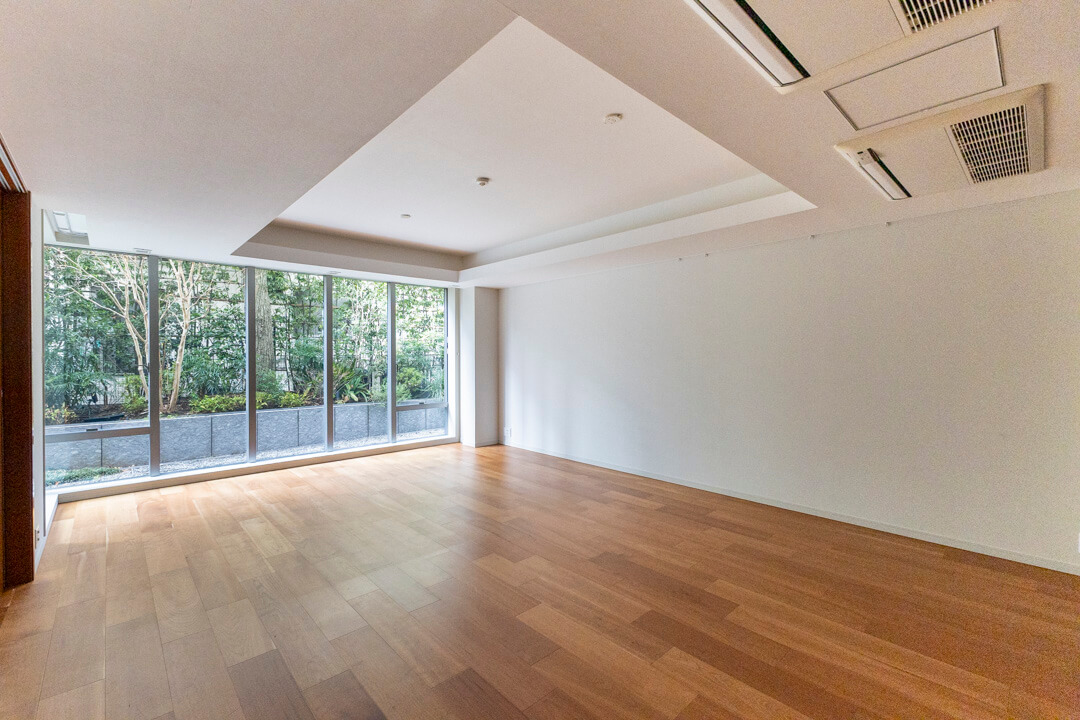 約22.4帖の広々としたリビングダイニング。南西側にハイサッシが並び、自然光が降り注ぎます。窓から植栽の緑が見えるのも嬉しいですね。折り上げ天井やビルトインエアコンが視線の抜けを生み、より一層の奥行きを演出。家族はもちろん、ゲストを招いても開放的にお過ごしいただける空間です。