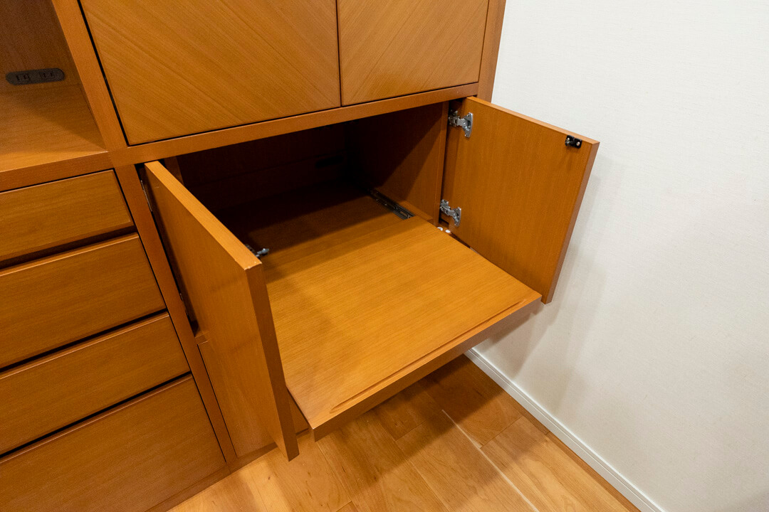 背面には収納力のあるカップボードを完備。木目デザインが空間に調和します。食料品のストックや食器類を整理整頓でき、散らかりがちなキッチンまわりがすっきり片付きそう。引出し可能なトレイボードにはコンセントが付いていて、キッチン家電の使用に便利です。