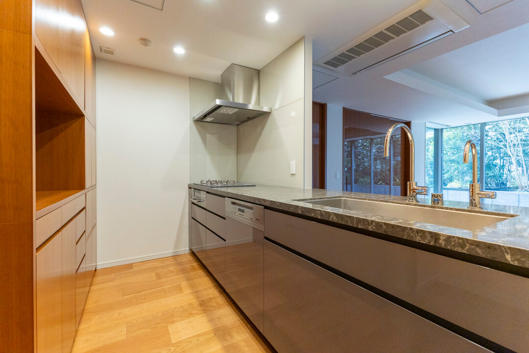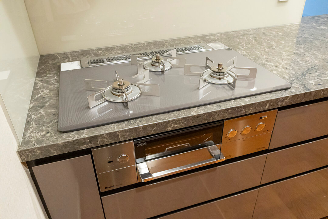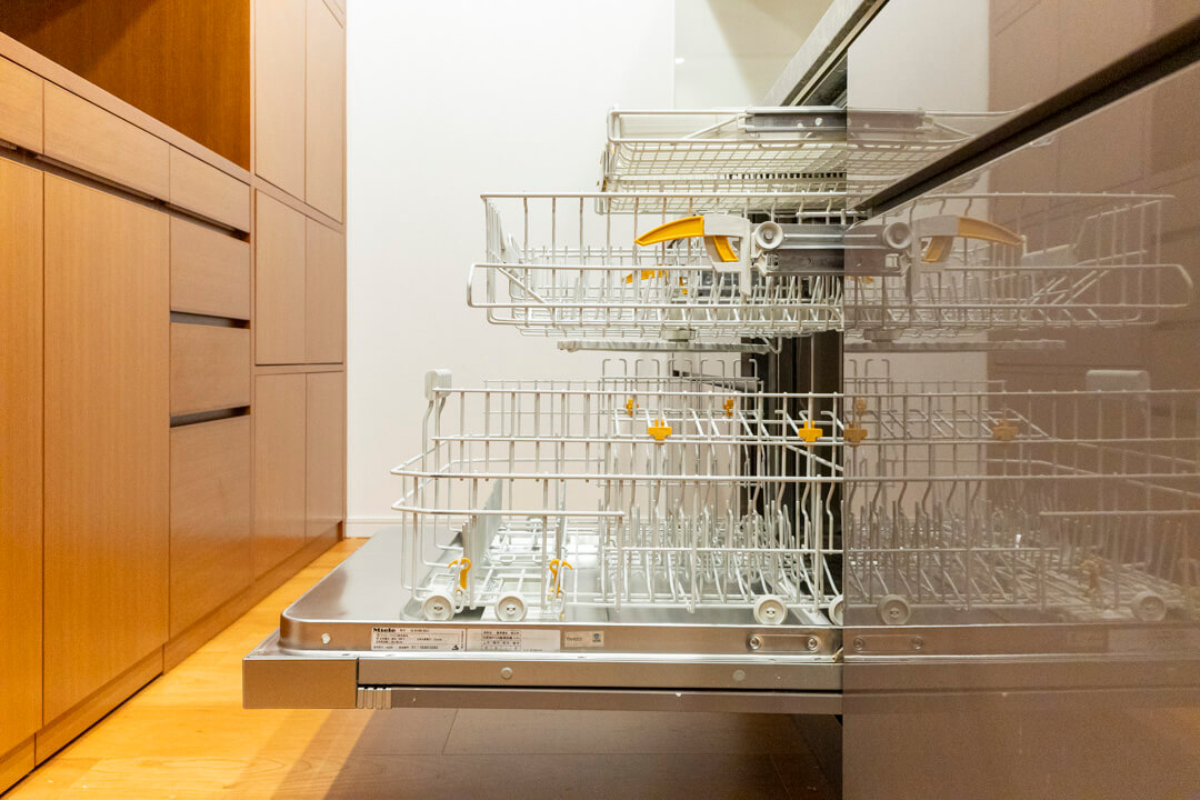 同時調理が叶うグリル付3口ガスコンロを内蔵。さらに、ディスポーザーとMiele(ミーレ)製の大容量食洗機も完備されています。料理後すぐに生ゴミを処理できるので、悪臭の原因を防ぎ、掃除の手間を軽減。食器洗いも捗り、後片付けの時短が叶います。