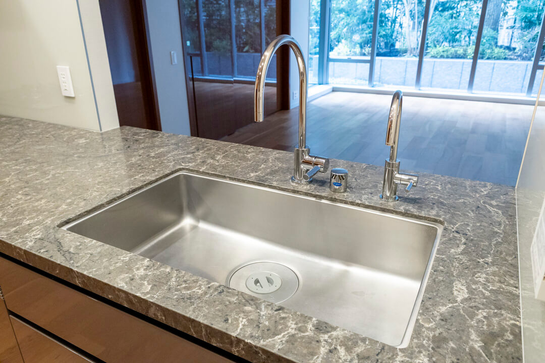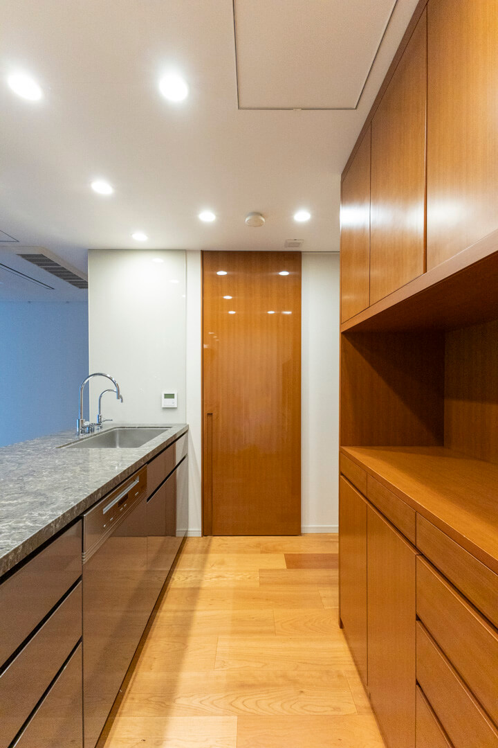 約4.6帖のゆとりあるキッチン。石調カウンターが重厚感を演出します。扉付きで独立した空間でありながら、シンク側からはリビングを見渡せる設計。開放感を保ち、家族との会話を楽しみながら調理が可能です。
