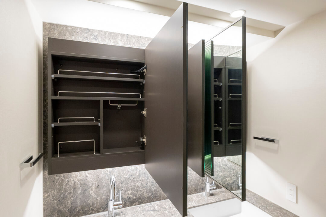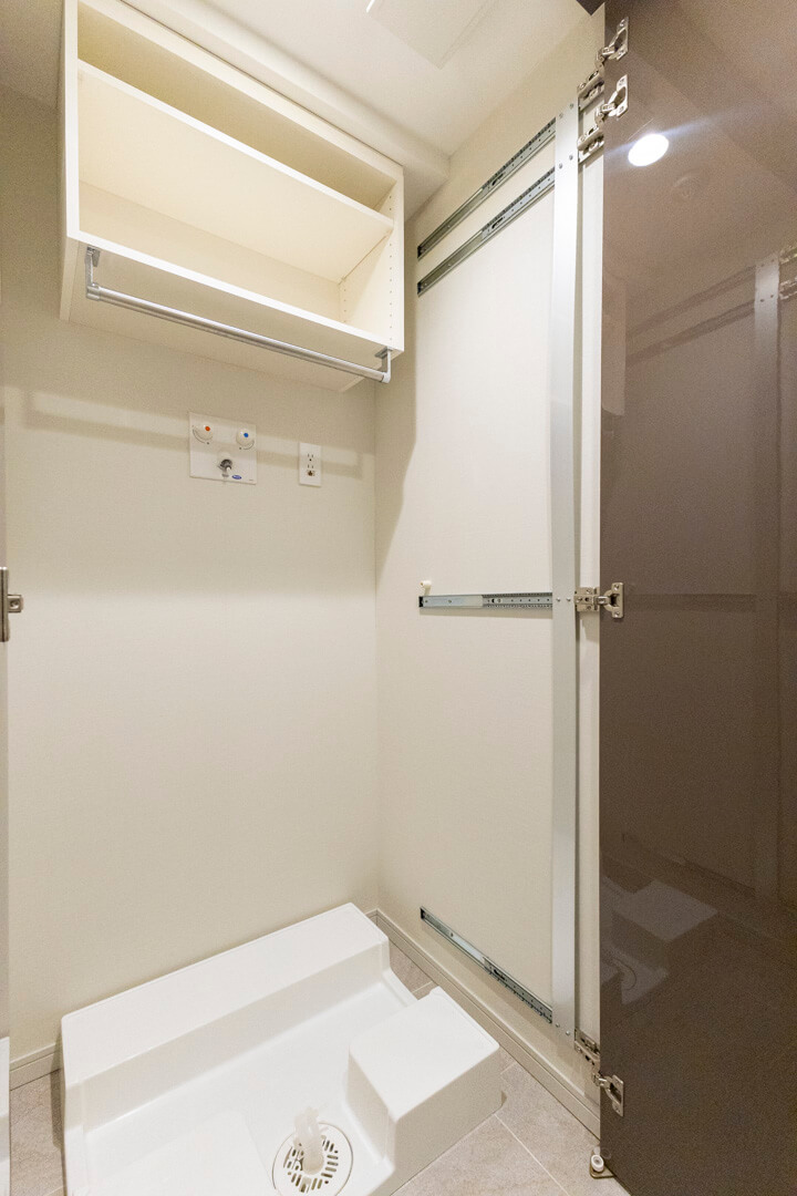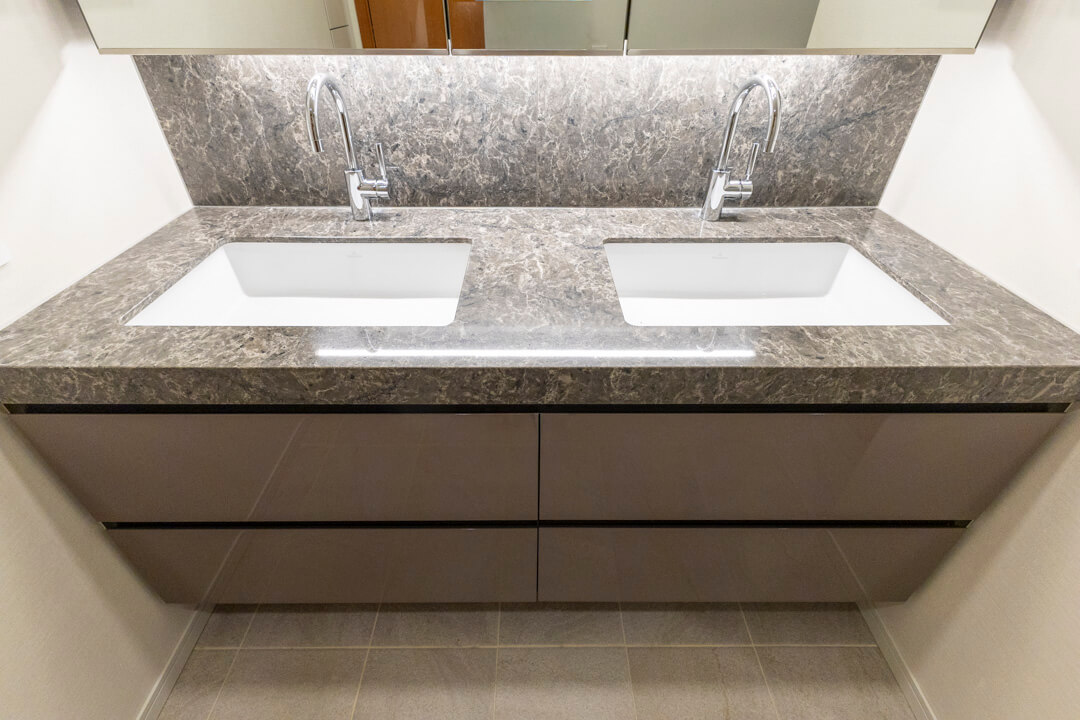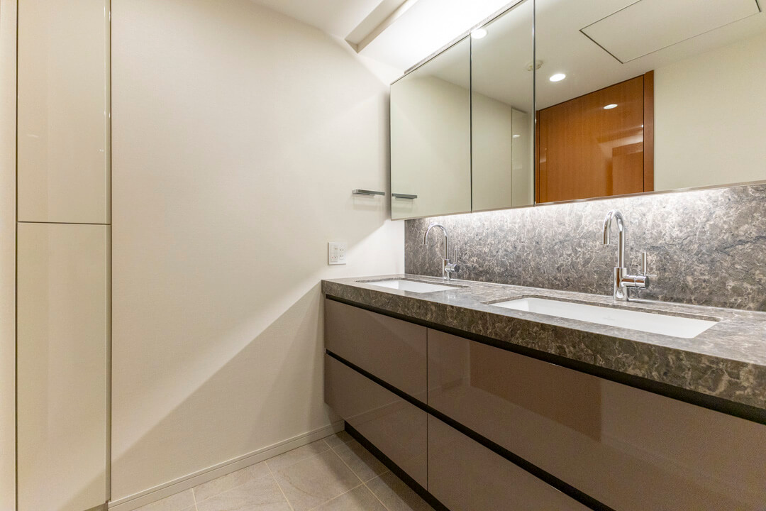 ホテルライクな2ボウルタイプの洗面化粧台。2人並んで使用でき、忙しい朝の身支度もスムーズに行えそうです。カウンタースペースにゆとりがあり、化粧品やドライヤーの仮置きができるのもポイント。大容量のミラーボックスやリネン庫完備で、いつも清潔な洗面室をキープできそうです。洗濯機置き場には扉があり、生活感が出る部分を目隠しできるのも嬉しいですね。