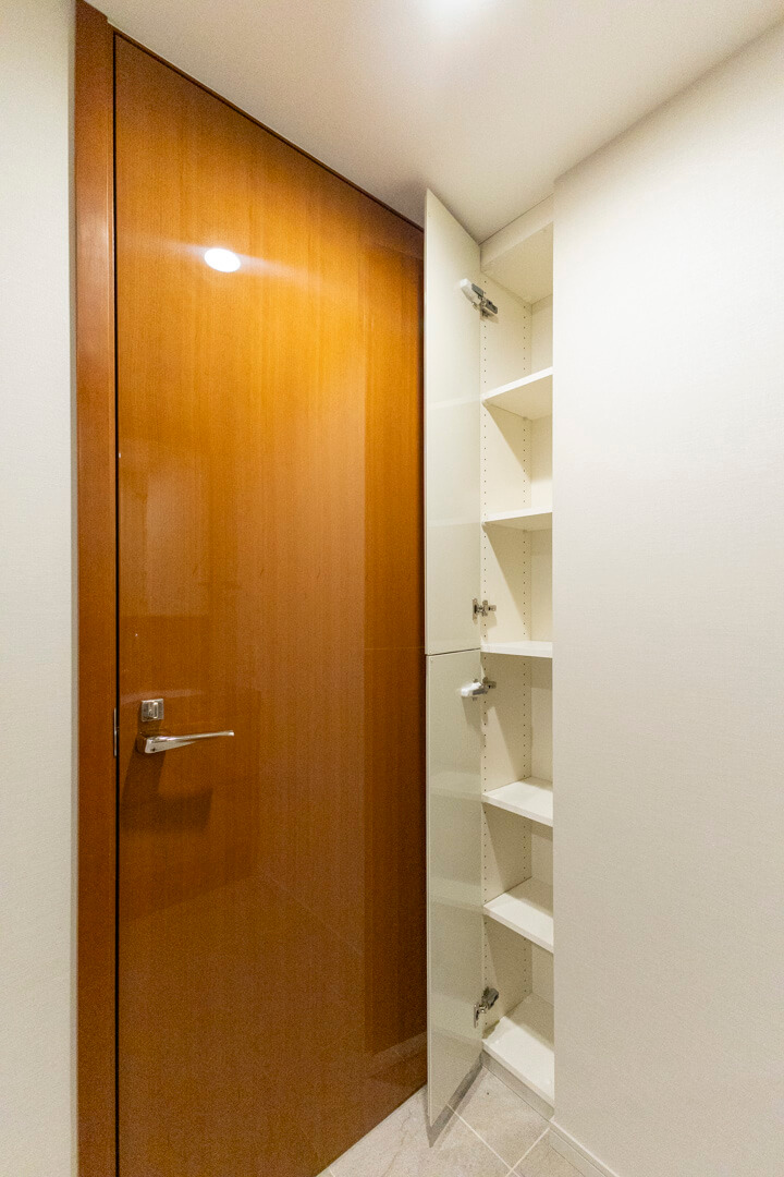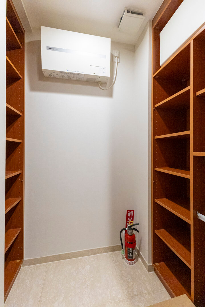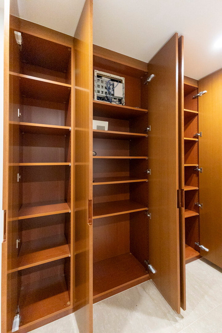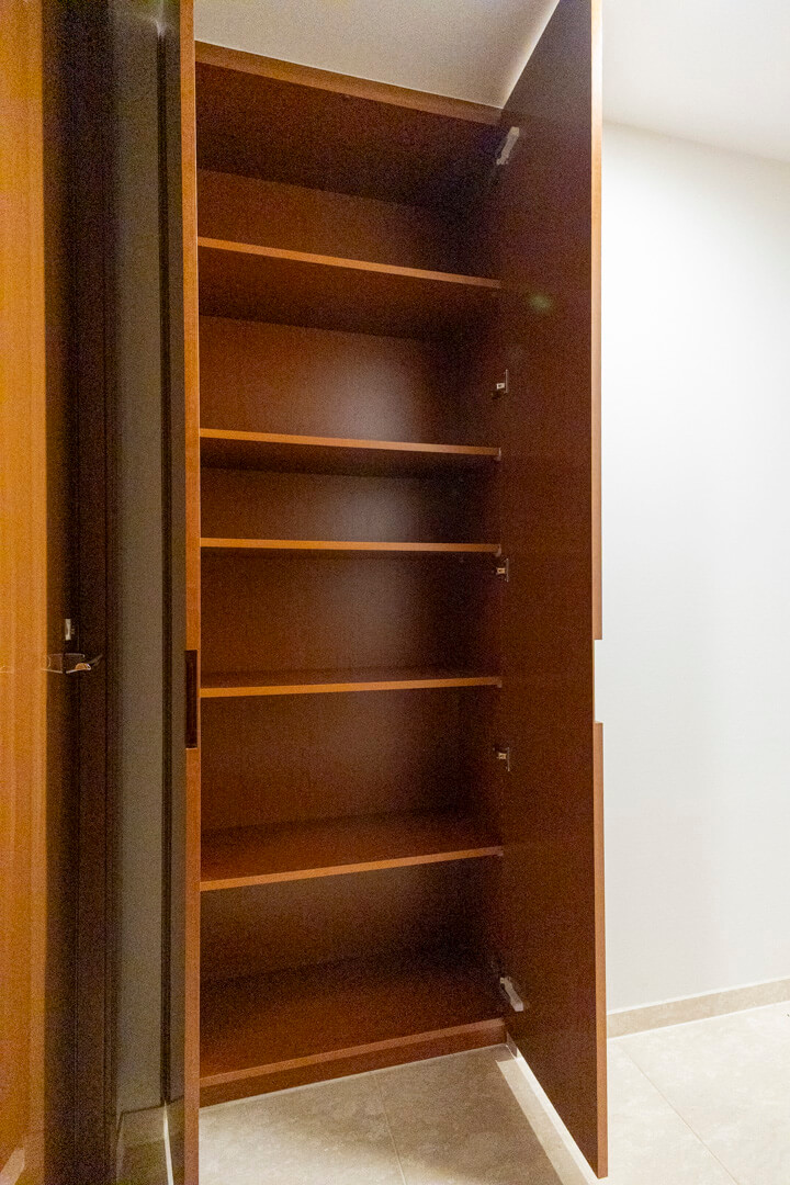 LDKに入ってすぐ右手には、大容量の収納を完備しています。自由度の高い可動棚で、使い勝手良好◎。生活小物や書類、日用品ストックなどを収納でき、すっきりとしたリビング空間を実現できそうです。
