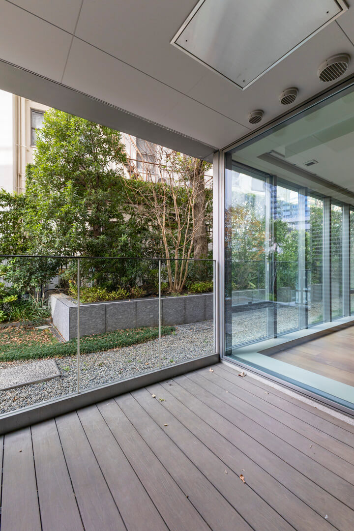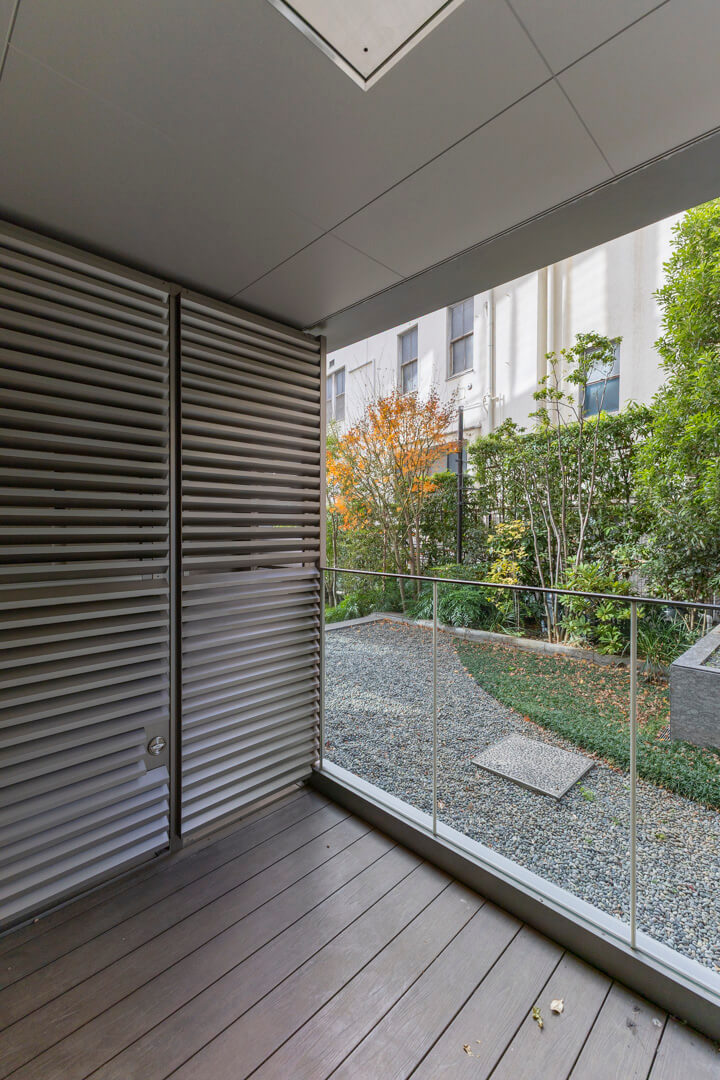 洋室2に接続するバルコニー。コンパクトながら、クリア壁を採用することで開放感のある空間に仕上がっています。ウッドデッキ敷きで気軽に出入りしやすいのも魅力。南西向きのため、晴れた日には心地よい陽光が差し込みます。