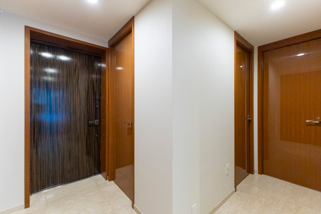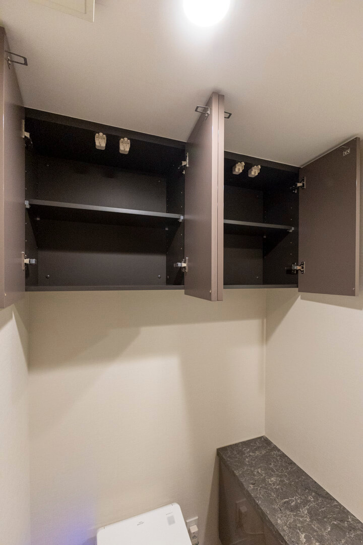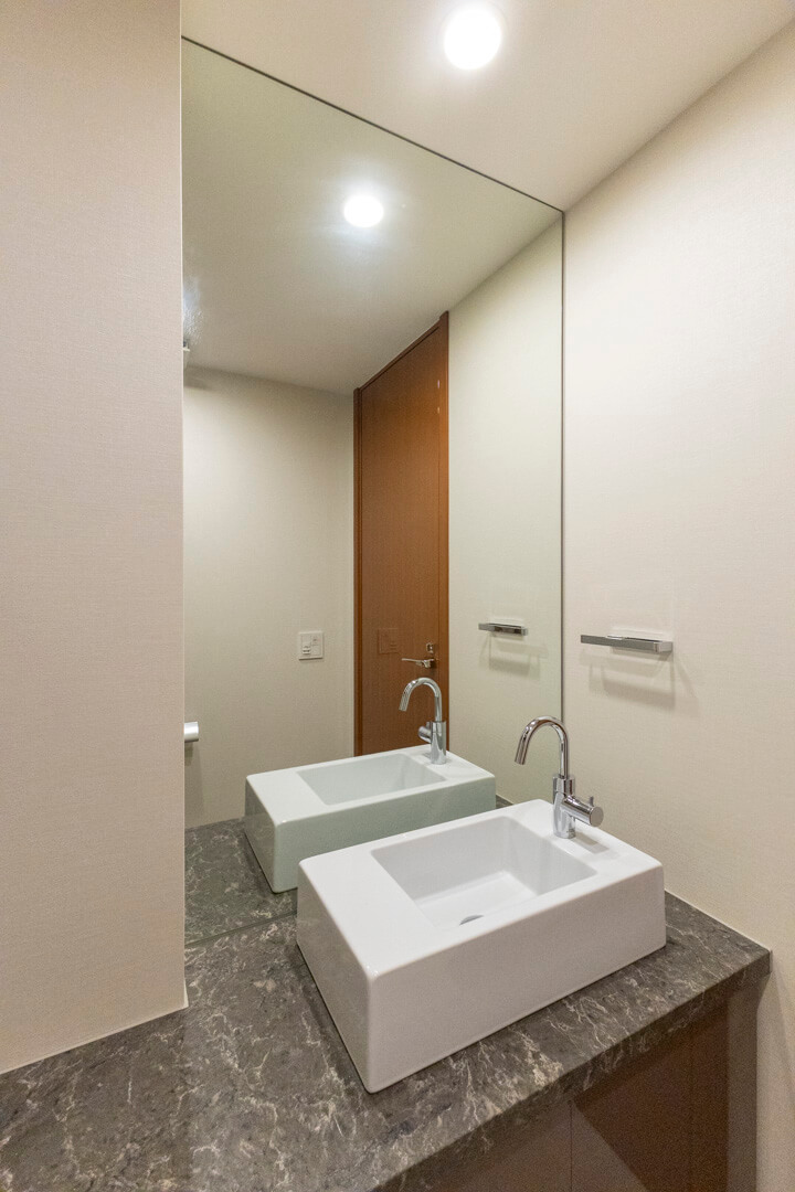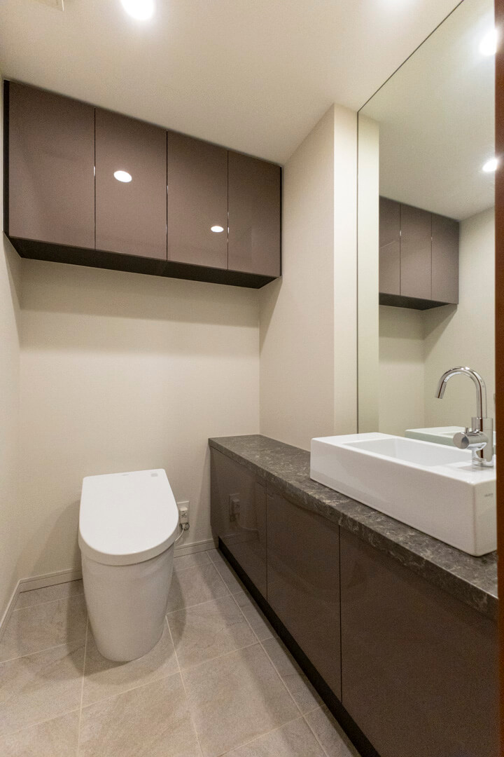 廊下に面していて独立性の高いレストルーム。TOTO製の洗浄機能付トイレを採用しています。タンクレス仕様でスタイリッシュですね。手洗いカウンター付きなのですぐに手を洗うことができ、ゲストを洗面室まで案内する手間もかかりません。大きな鏡でさっと身だしなみチェックができるのも嬉しいポイントです。また、自動点灯式なので消し忘れの心配がなく、節電効果も期待できます。