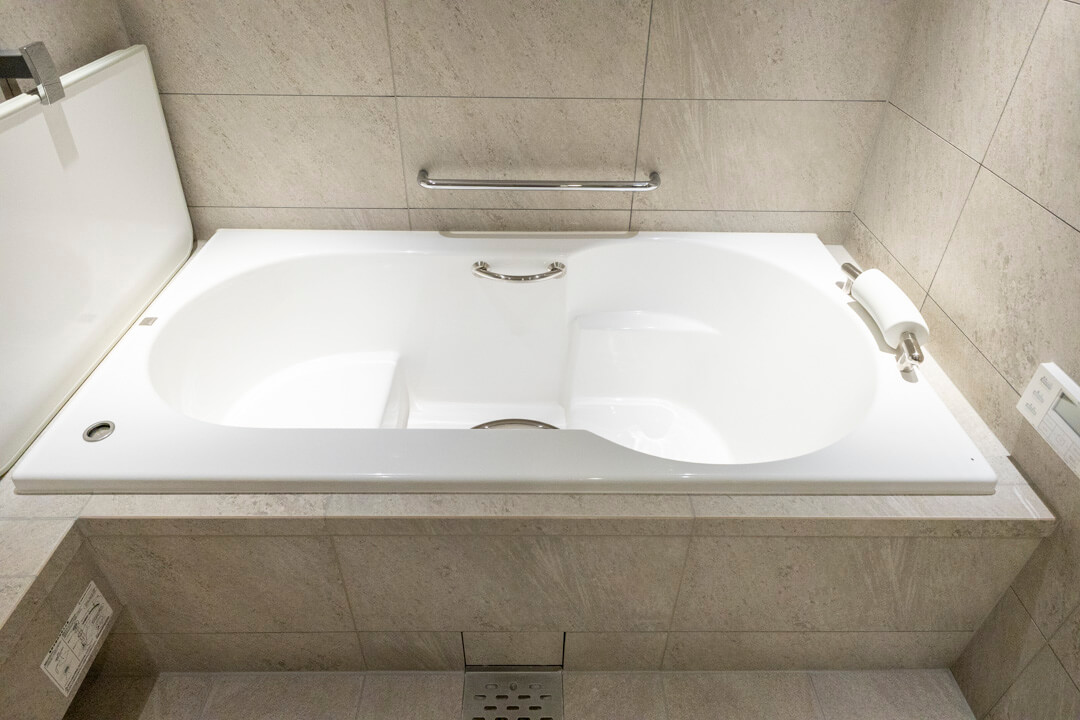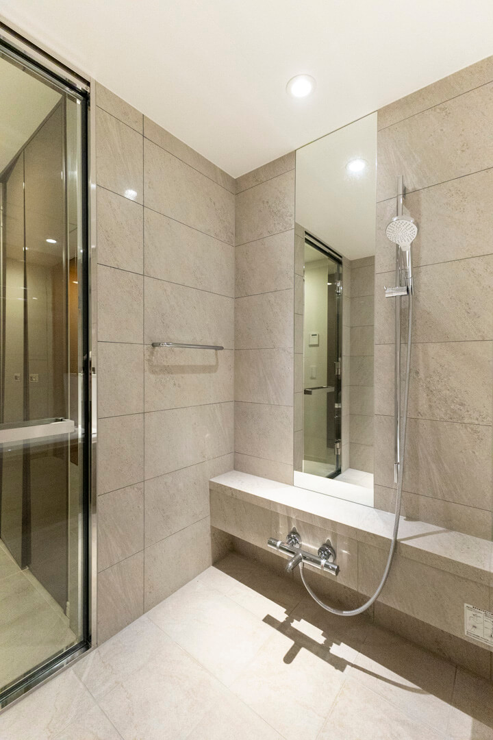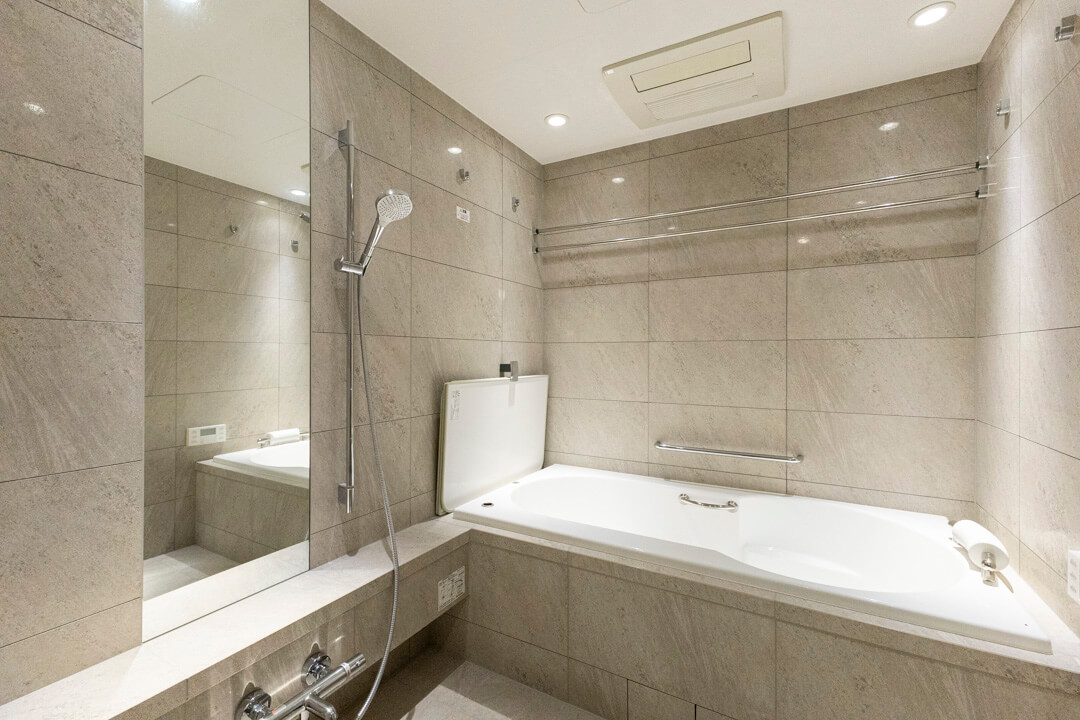 石調デザインが高級感を演出するバスルーム。ベンチやヘッドレスト付きの浴槽を採用し、全身浴・半身浴ともにゆったりとお楽しみいただけます。浴室換気乾燥暖房機を備え、寒い日も快適。カビ対策や雨の日のお洗濯にも役立ち、追い焚き機能も搭載されています。