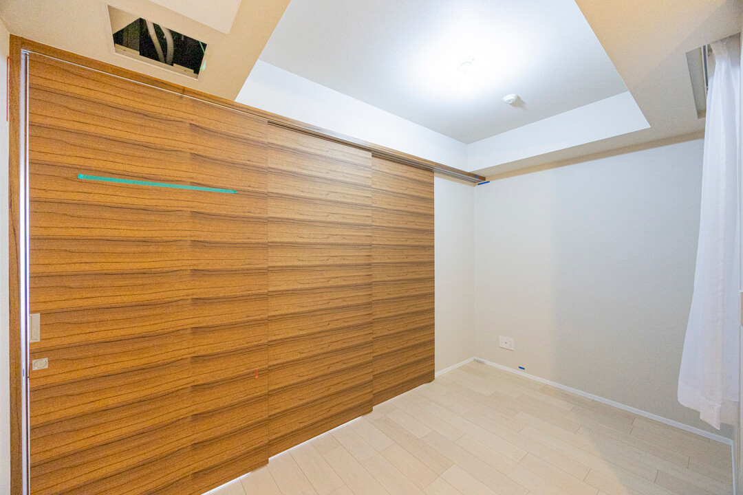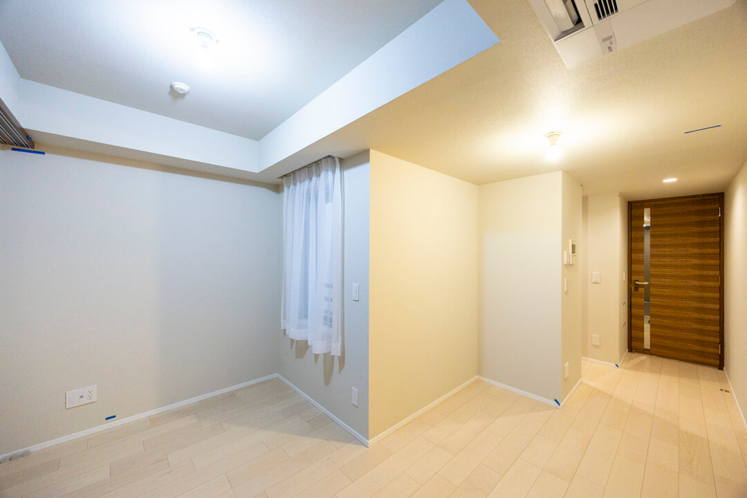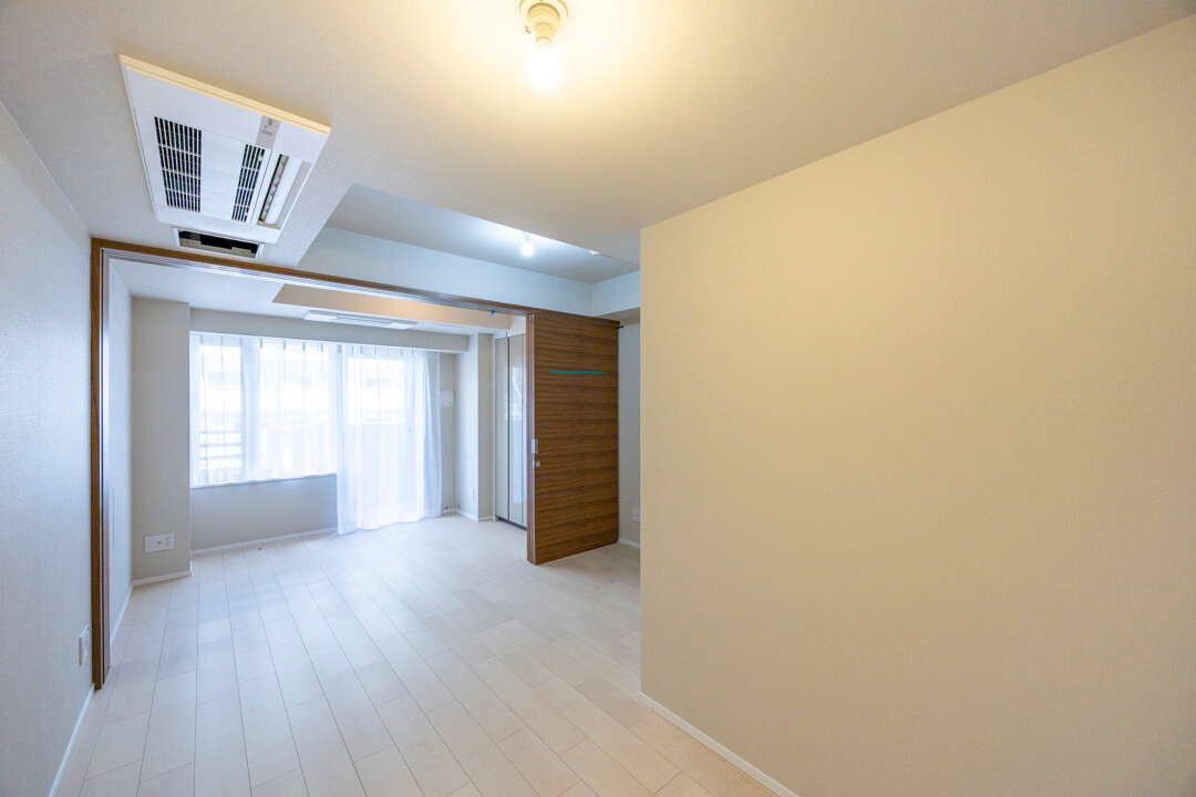 約11.7帖のリビングダイニングキッチンです。寝室との仕切りは引戸になっており、寝室と繋げて使うこともできます。床にレールがないタイプのため、シームレスにお使いいただけますよ。また、フローリングには床暖房が付いており、足元からぽかぽか温まることができます。床暖房は、床から直接伝わる熱(伝導熱)と床から部屋全体に広がる熱(ふく射熱)の組み合わせで暖まります。埃が舞いにくく、空気が乾燥しにくいのも◎です。