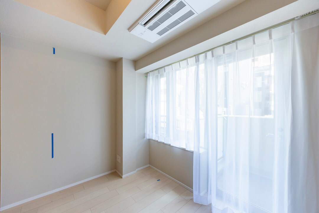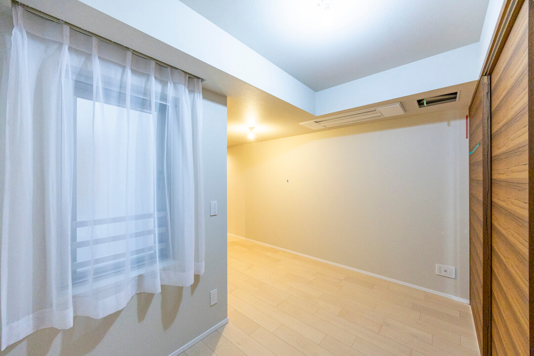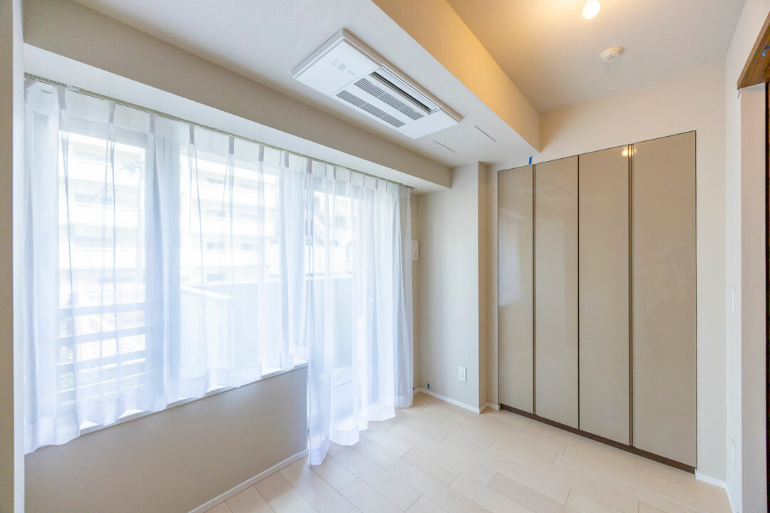 約4.4帖の寝室はコンパクトですが、窓が大きく造られているので空間を圧迫感がありません。エアコンは埋め込み式のためすっきりとした印象に。パイプハンガーや棚が設置してあるクローゼットが付いており、収納スペースも確保されています。また、窓からは約4.08㎡のバルコニーにアクセスできるので気分転換にも◎。
