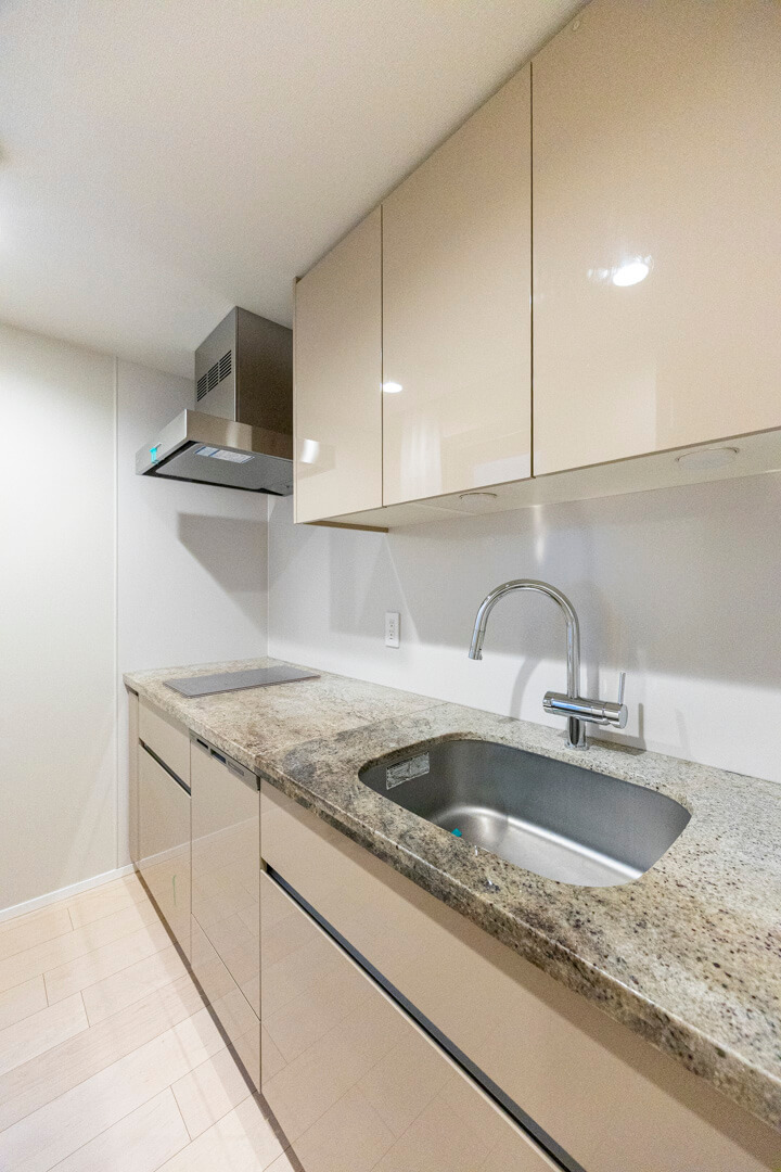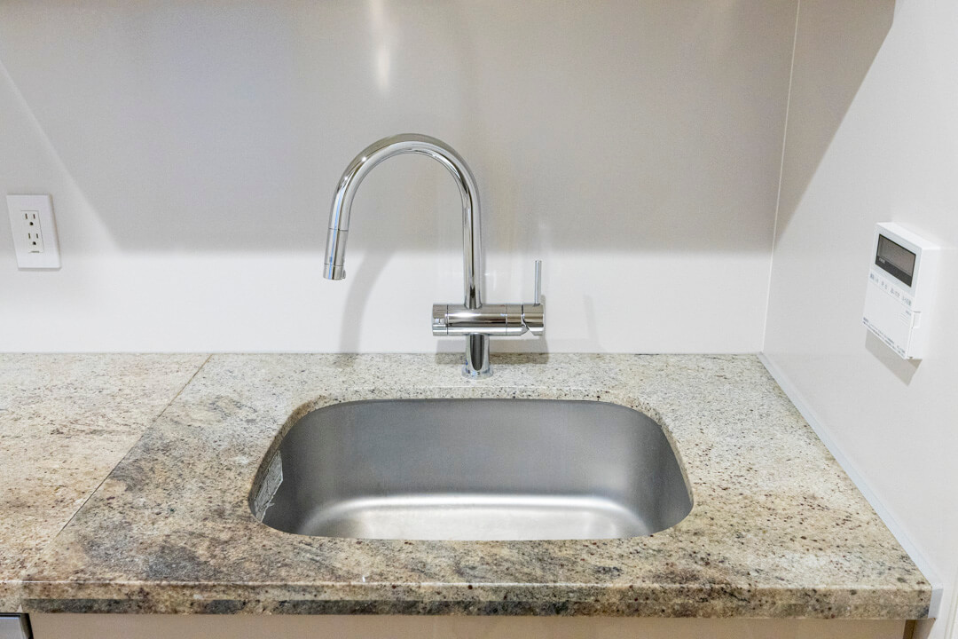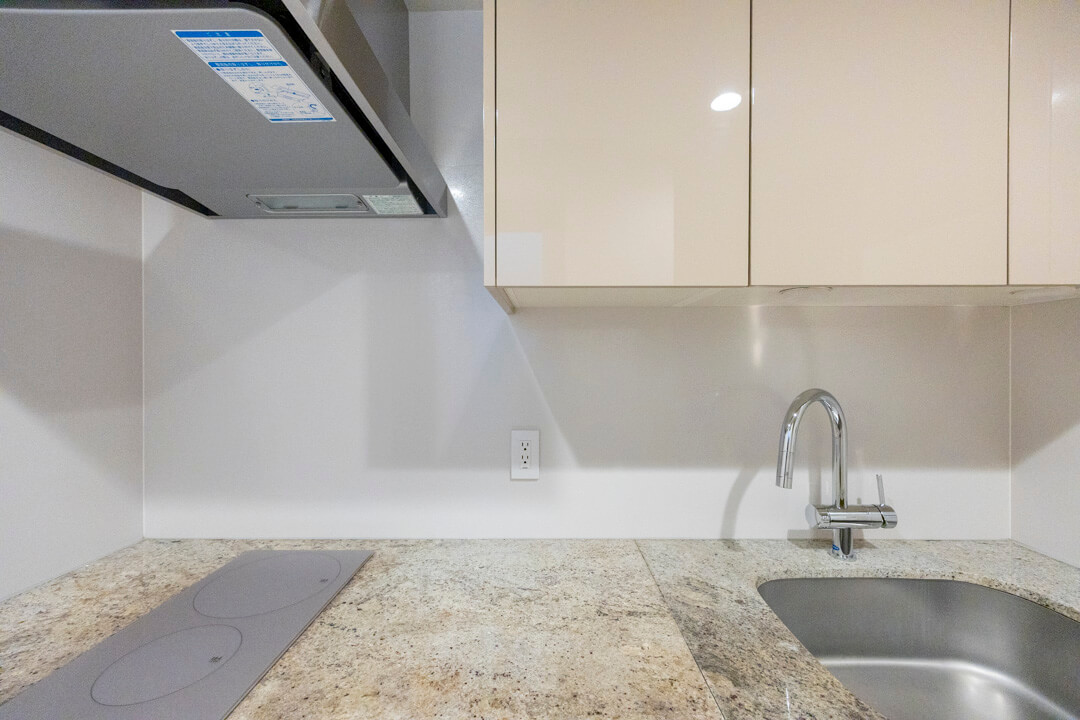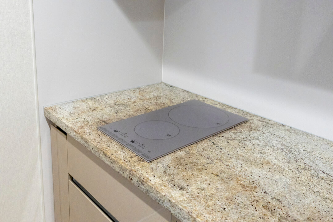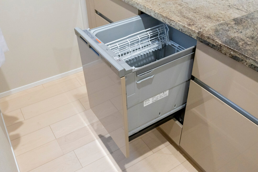 2口IHクッキングヒーター、グリル、ディスポーザー、食洗機付きと設備面も充実しています。作業スペースにはコンセントが付いているので、その場でミキサーやコーヒーメーカーなどのキッチン家電を使用することができますよ。