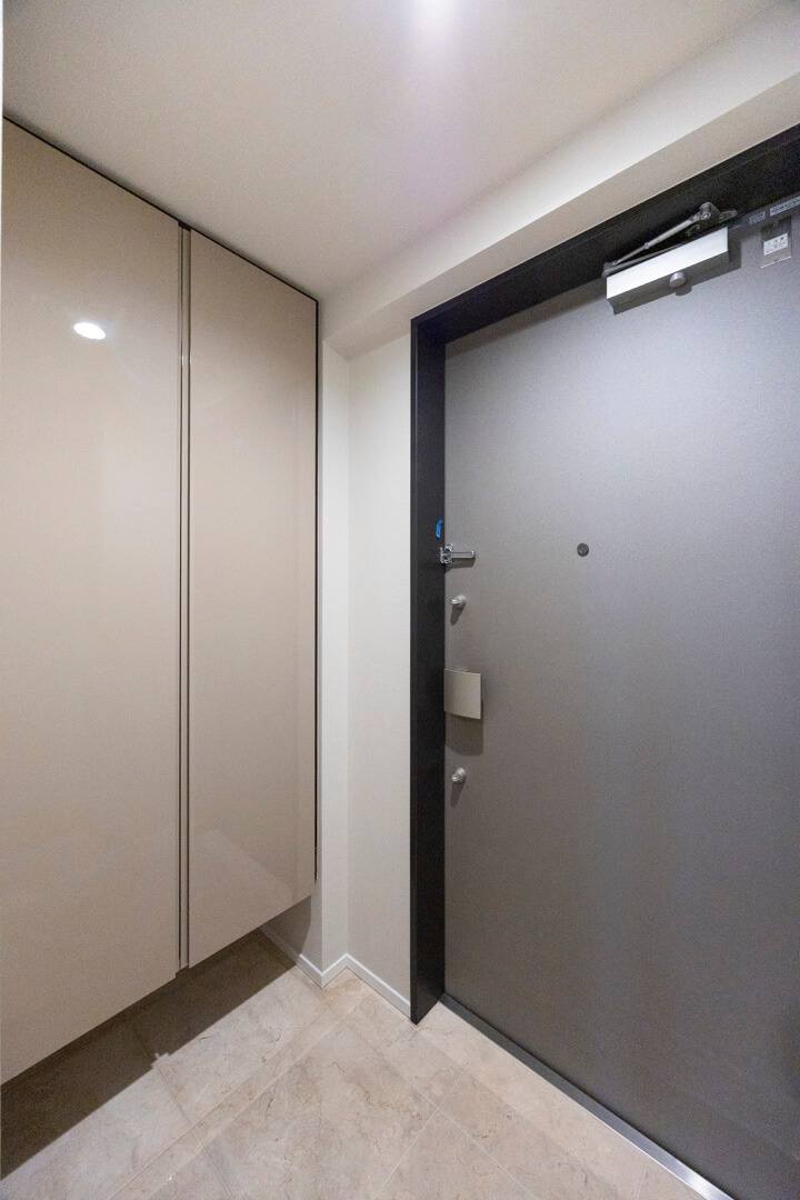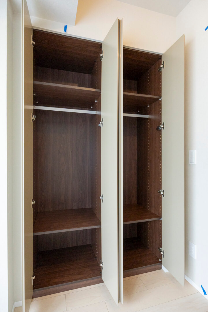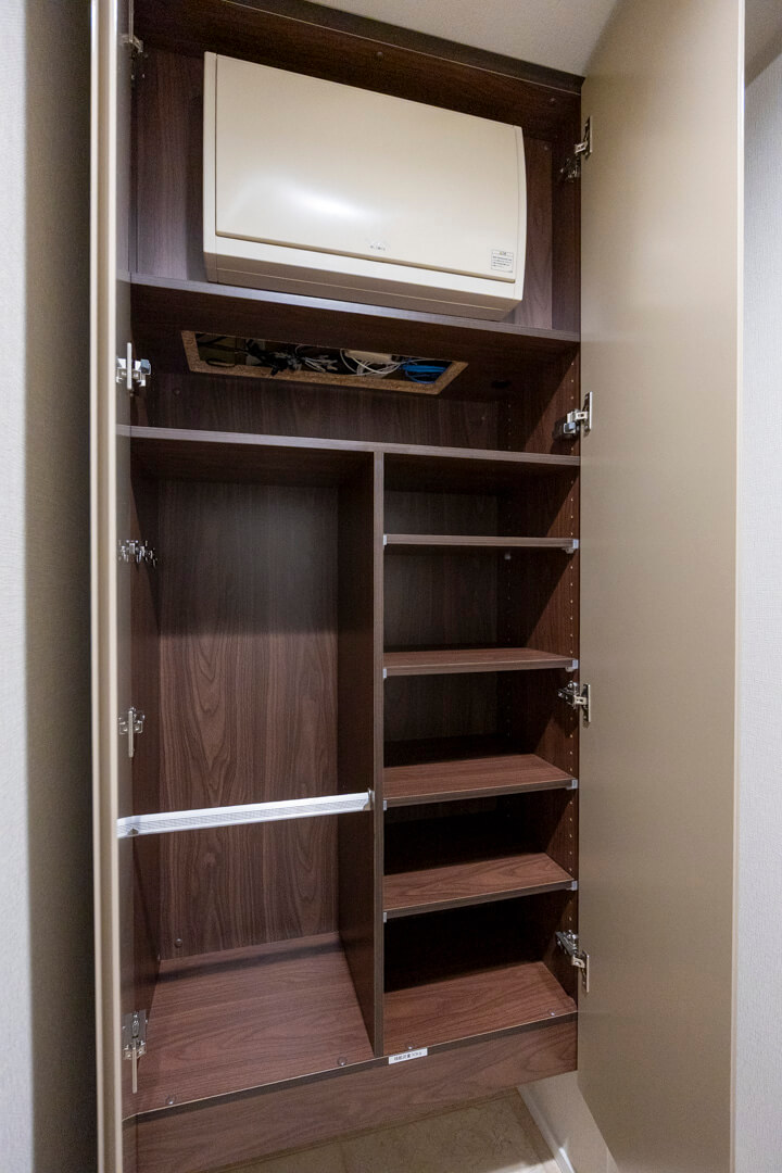 玄関入って右側にはシューズボックスが備え付けられています。高さがありますが、フロートタイプのため空間に広がりをプラスしてくれますよ。中には傘立てスペースもあり、使い勝手良好です。