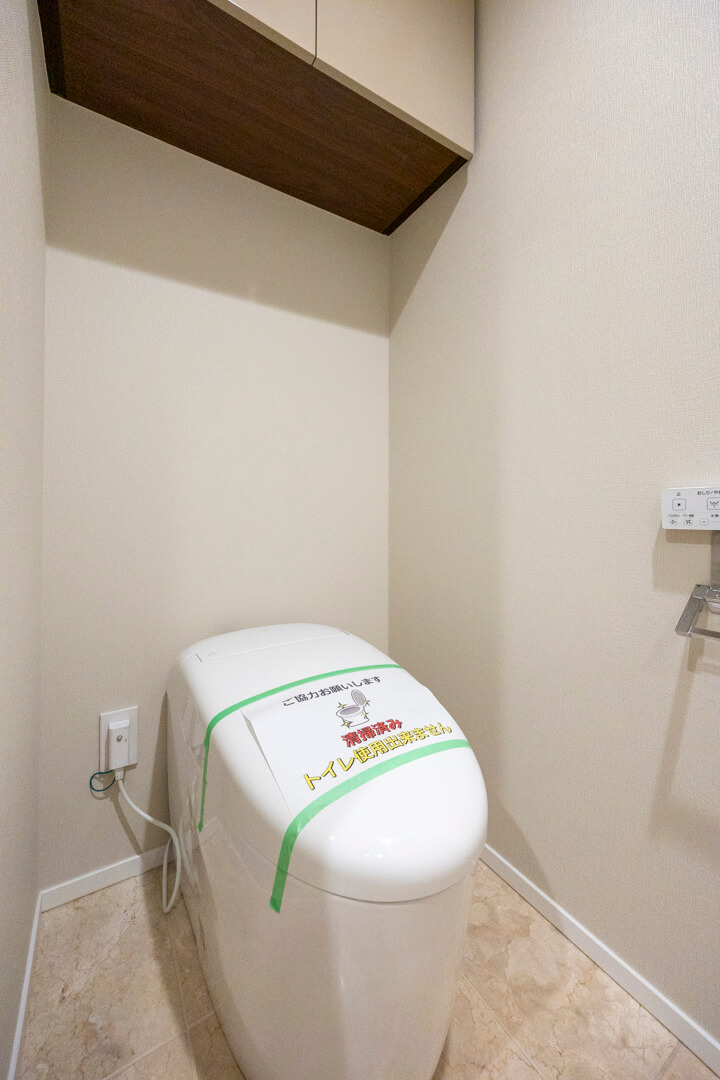 ウォシュレット一体型のトイレです。タンクレスタイプでお手入れも簡単。上部には吊戸棚が設置されているので、トイレットペーパーや掃除用具などを収納することができます。
