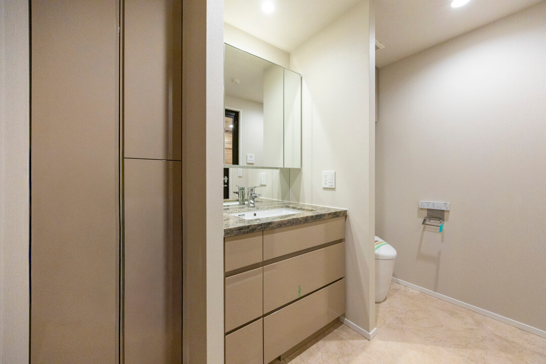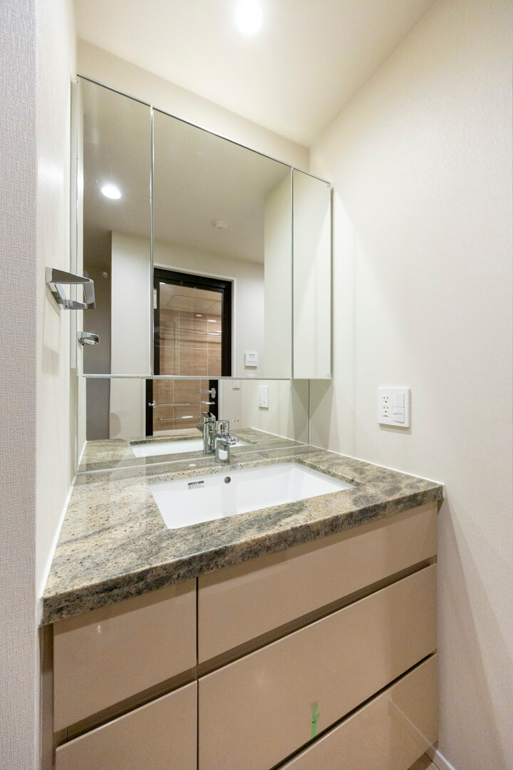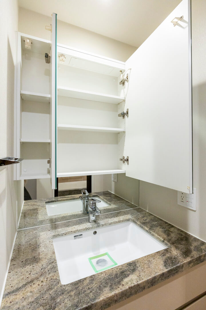 石目調のカウンターで高級感がある洗面化粧台です。三面鏡の中には化粧品が収納できて使い勝手良好。横には棚が造られているので、ごちゃごちゃしがちな洗面まわりもきちんと整頓できます。