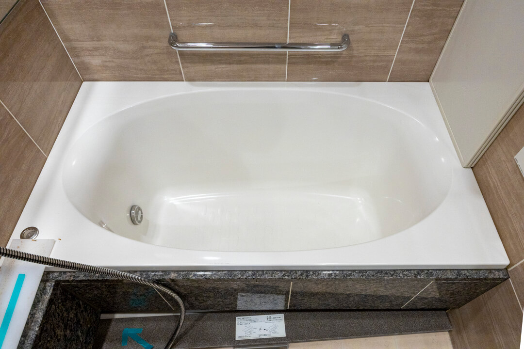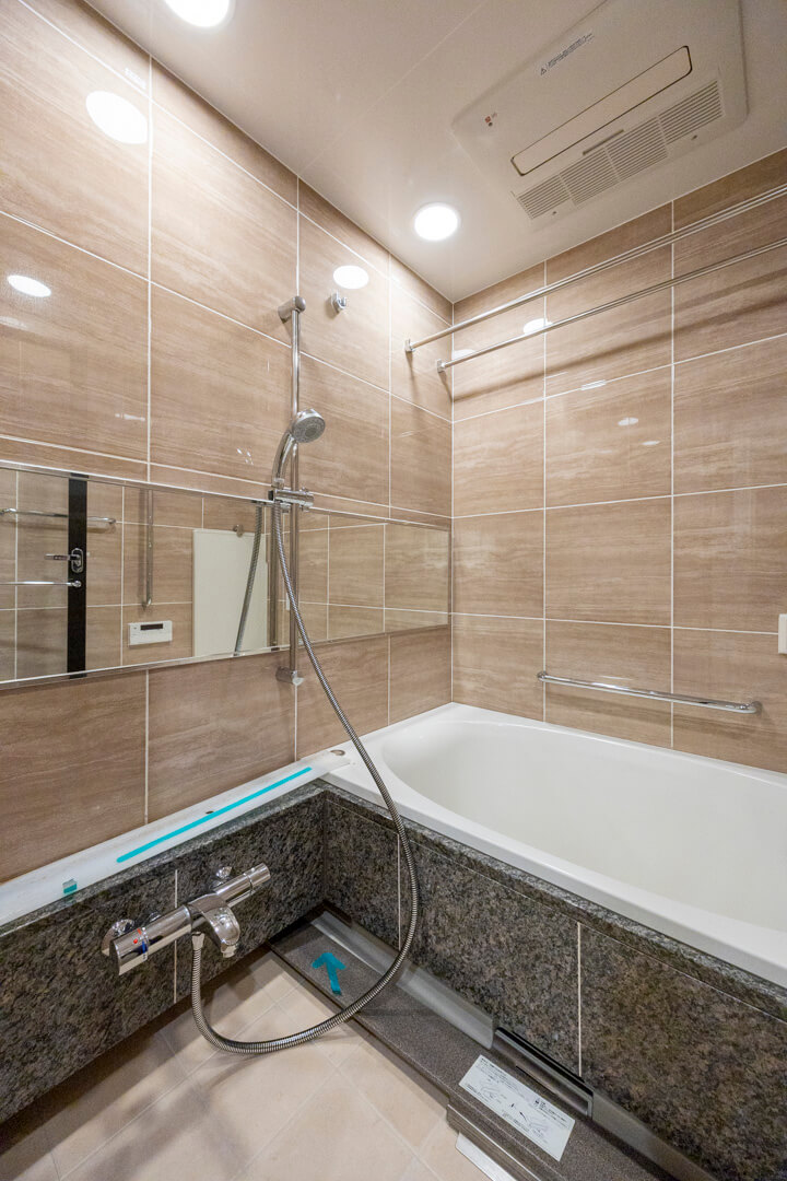 落ち着いた印象でワイドミラーが奥行きをもたらしている1416サイズのバスルームです。お風呂にゆっくり浸かるのが好きという方に嬉しい追い焚き機能を搭載。家族の入浴時間がずれてしまっても安心です。また、照明には調光機能が付いているので、気分に合わせて雰囲気を変えることができますよ。さらに、浴室乾燥機が設置されており、雨の日の洗濯物にも困りません。
