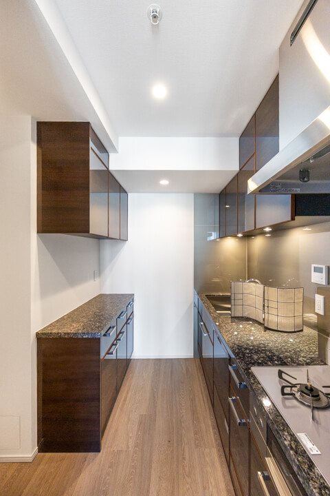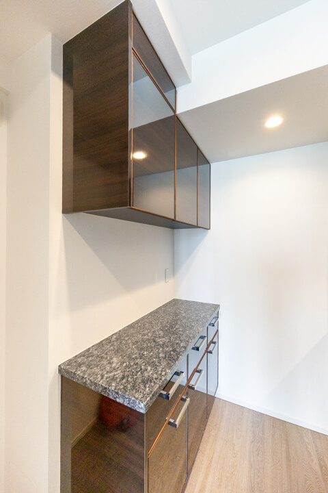 キッチンの背面側にはカップボードが備え付けられています。調味料や食器などを収納できるだけでなく、電子レンジなどを置くこともできるので便利です。
