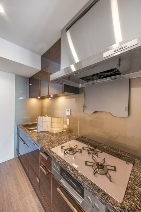 3口コンロ、グリル、食洗機付きと設備面も充実しています。作業スペースにはコンセントが付いています。その場でミキサーやコーヒーメーカーなどのキッチン家電を使用することができるので使い勝手良好です。