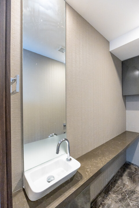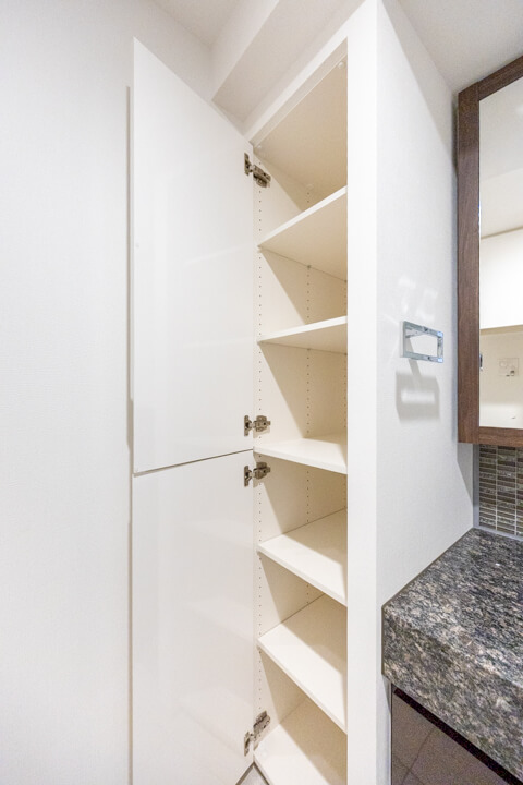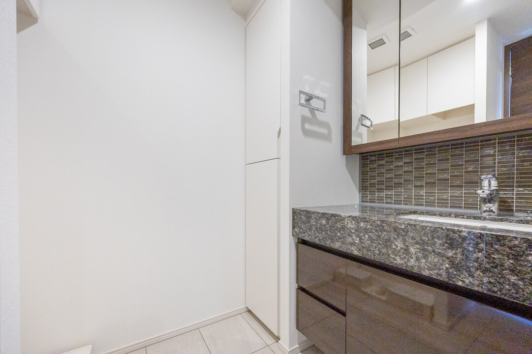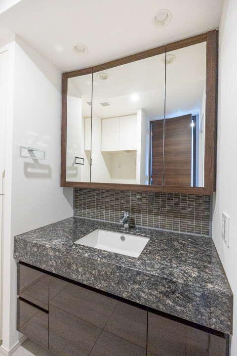 石目調のカウンターで高級感が漂う洗面化粧台です。三面鏡の中には化粧品が収納できて使い勝手良好。横にはリネン庫が造られているので、ごちゃごちゃしがちな洗面まわりもきちんと整頓できます。