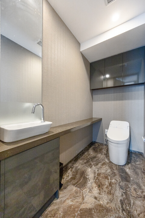 ウォシュレット一体型のトイレです。タンクレスタイプなのですっきりとした印象に。また、別途で手洗い器と鏡が造られているので、その場でサッと身だしなみを整えることができます。上部には吊戸棚が設置されていて、収納スペースもありますよ。カウンタースペースにはアロマなどを置いても◎。