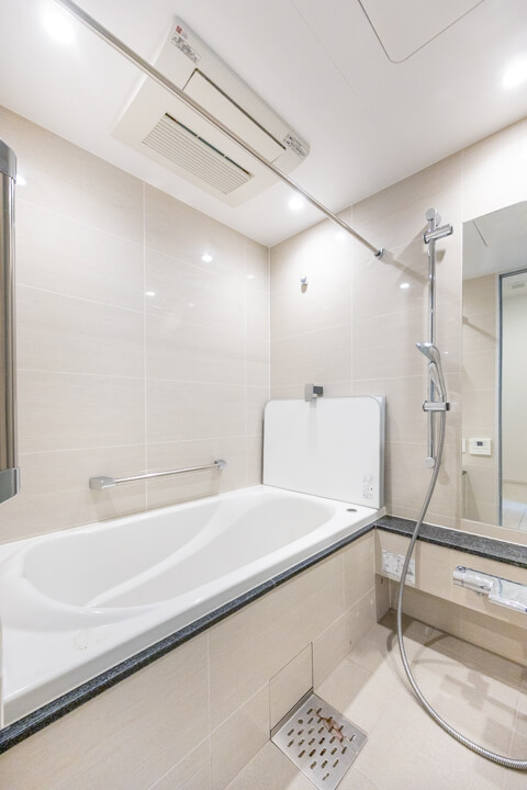 ベージュトーンで落ち着いた雰囲気のバスルームです。お風呂にゆっくり浸かるのが好きという方に嬉しい追い焚き機能を搭載。家族の入浴時間がずれてしまっても安心です。また、浴室乾燥機付きのため、雨の日の洗濯物にも困りません。
