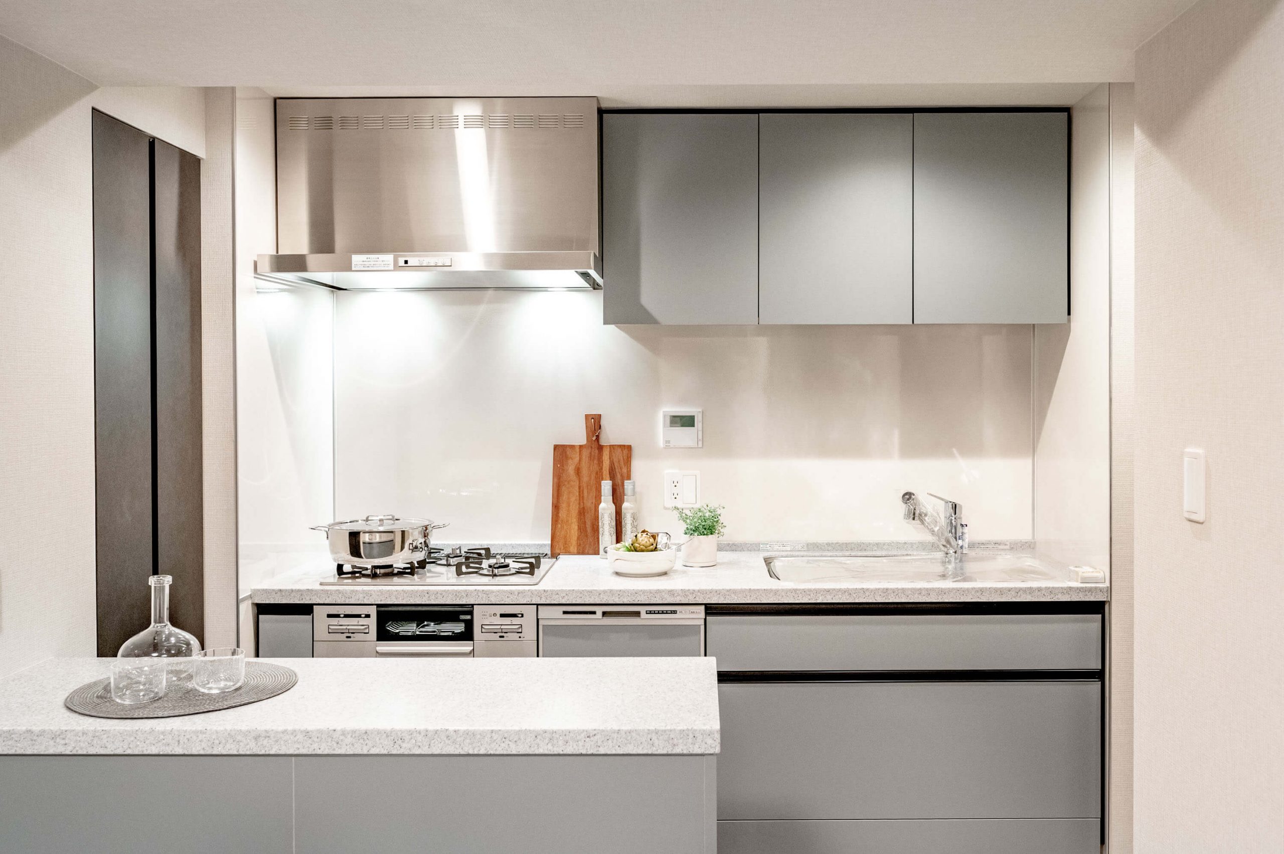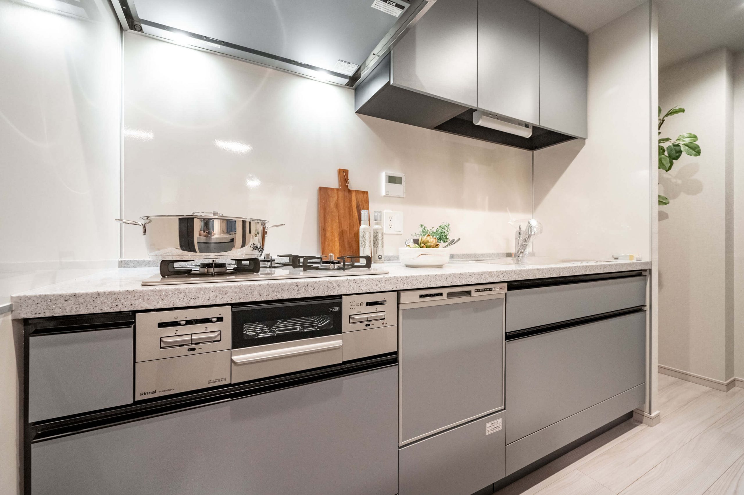 3口コンロ、グリル、食洗機付きと設備面も充実しています。また、作業スペースにはコンセントが付いているので、その場でミキサーやコーヒーメーカーなどのキッチン家電を使用することができます。