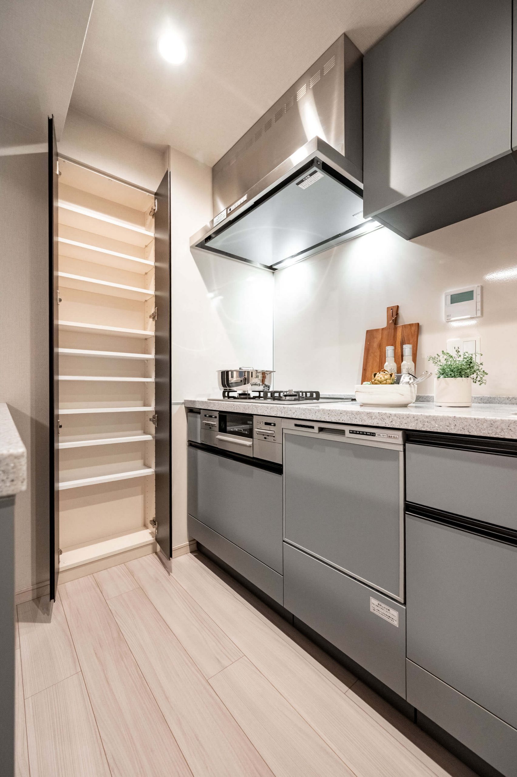 約3.3帖のキッチンにはパントリーや棚などがあり、収納スペースが豊富。リビングダイニング側に造られているカウンターは配膳にも便利で◎。