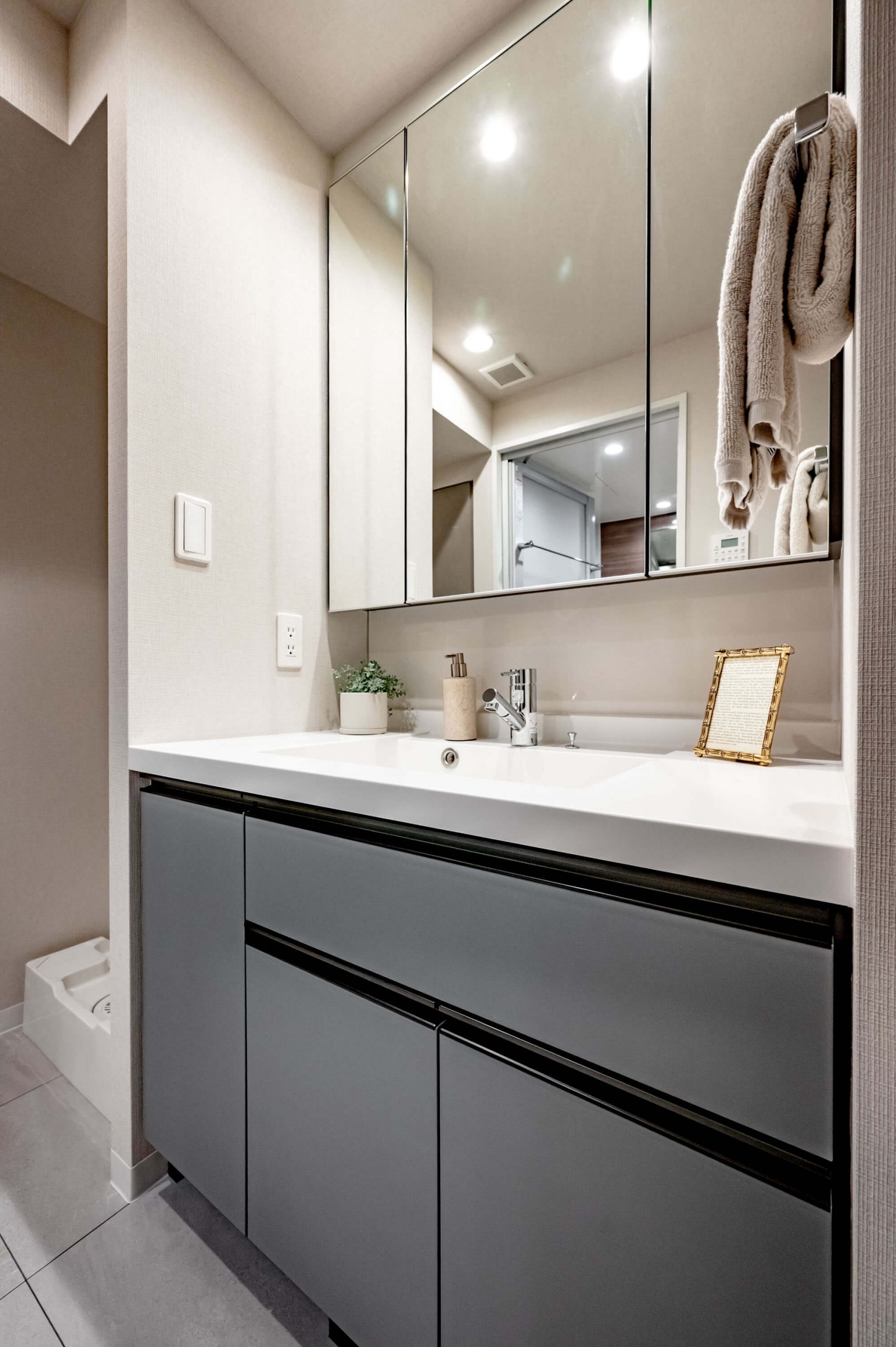 スタイリッシュな印象の洗面化粧台です。三面鏡の中には化粧品が収納できて使い勝手良好。背面側にはリネン庫が造られているので、ごちゃごちゃしがちな洗面まわりもきちんと整頓できます。