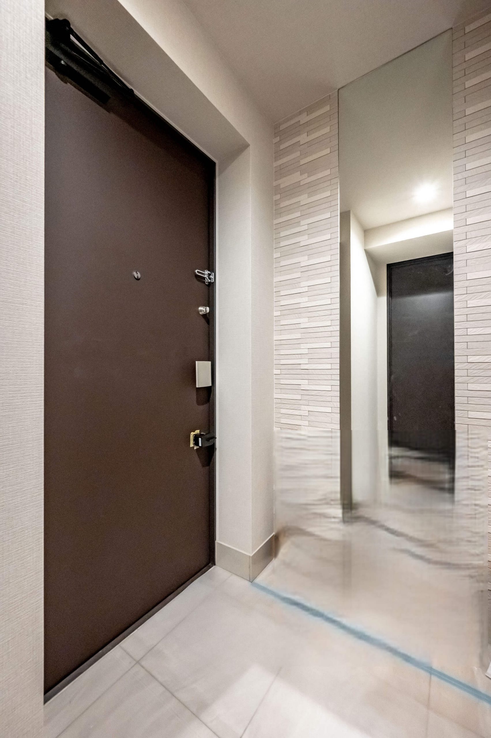 玄関入って正面には約0.5帖のシューズインクローゼットが造られています。たくさんの靴が収納できて便利ですね。また、壁面には鏡が設置されているので、出かける際に全身のコーディネートをチェックすることができます。