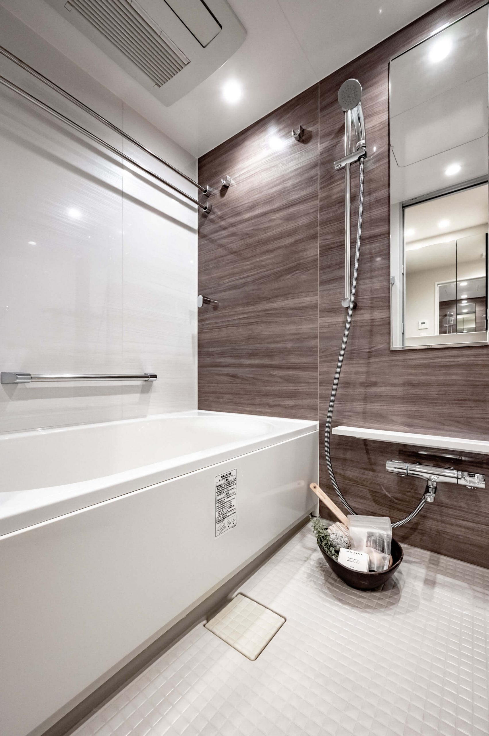 ブラウンの壁パネルが落ち着いた雰囲気を演出してくれている浴室です。お風呂にゆっくり浸かるのが好きという方に嬉しい追い焚き機能を搭載。家族の入浴時間がずれてしまっても安心です。また、浴室乾燥機のため雨の洗濯物にも困りません。