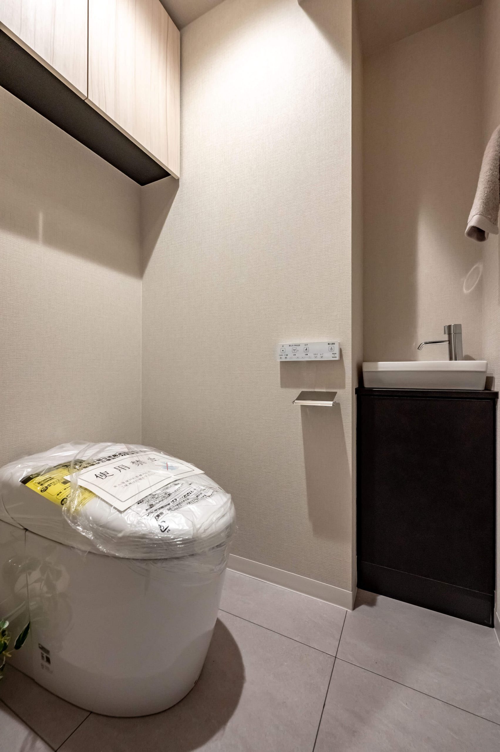 ウォシュレット一体型のトイレです。タンクレスタイプなのですっきりとした印象に。また、別途で手洗い器が造られているので、すぐに手を洗うことができて衛生的です。上部には吊戸棚が設置されていて、収納スペースもありますよ。カウンタースペースにはアロマなどを置いても◎。