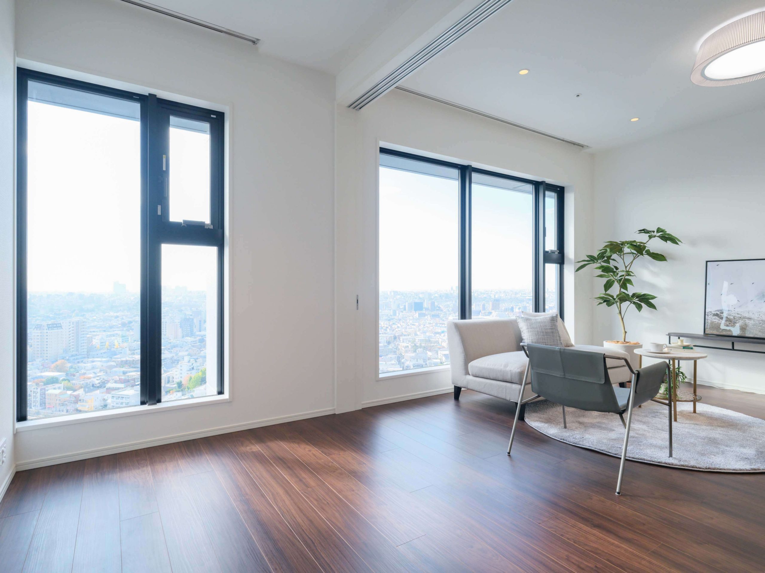 キッチンスペースを含め、約13.4帖のLDK。南西向きで陽当り良好。窓が大きく開放感もたっぷりと感じられます。23階部の高層階につき見晴らしも良好です。また、床暖房も設置されていて、冬場でも足元からじんわりと温まれます。床に直接座ったり、寝転んでもひんやり感なく過ごせます。