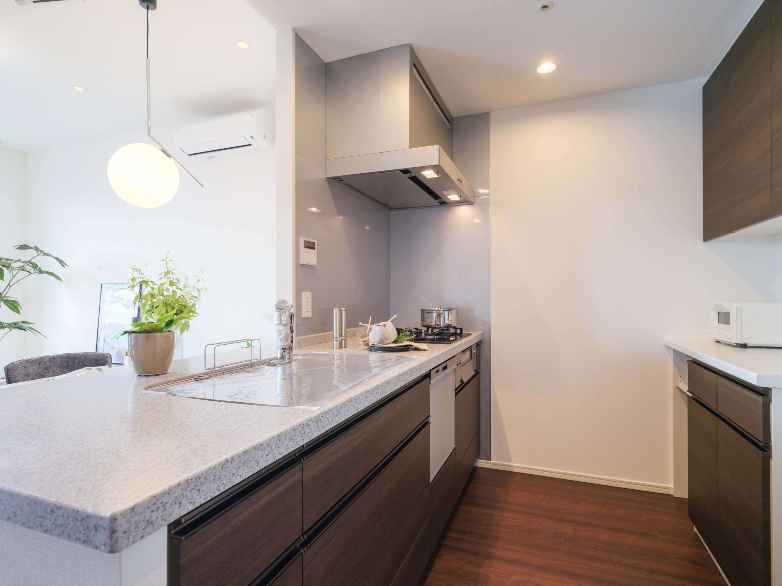 家族やゲストと会話が弾む、対面型のシステムキッチン。小さなお子さんがいるご家庭では子どもの姿も見守れます。料理が捗る3口ガスコンロ、家事の時短に心強い食洗機付き。カップボードと納戸も付いていて、収納スペースがしっかりと確保されています。