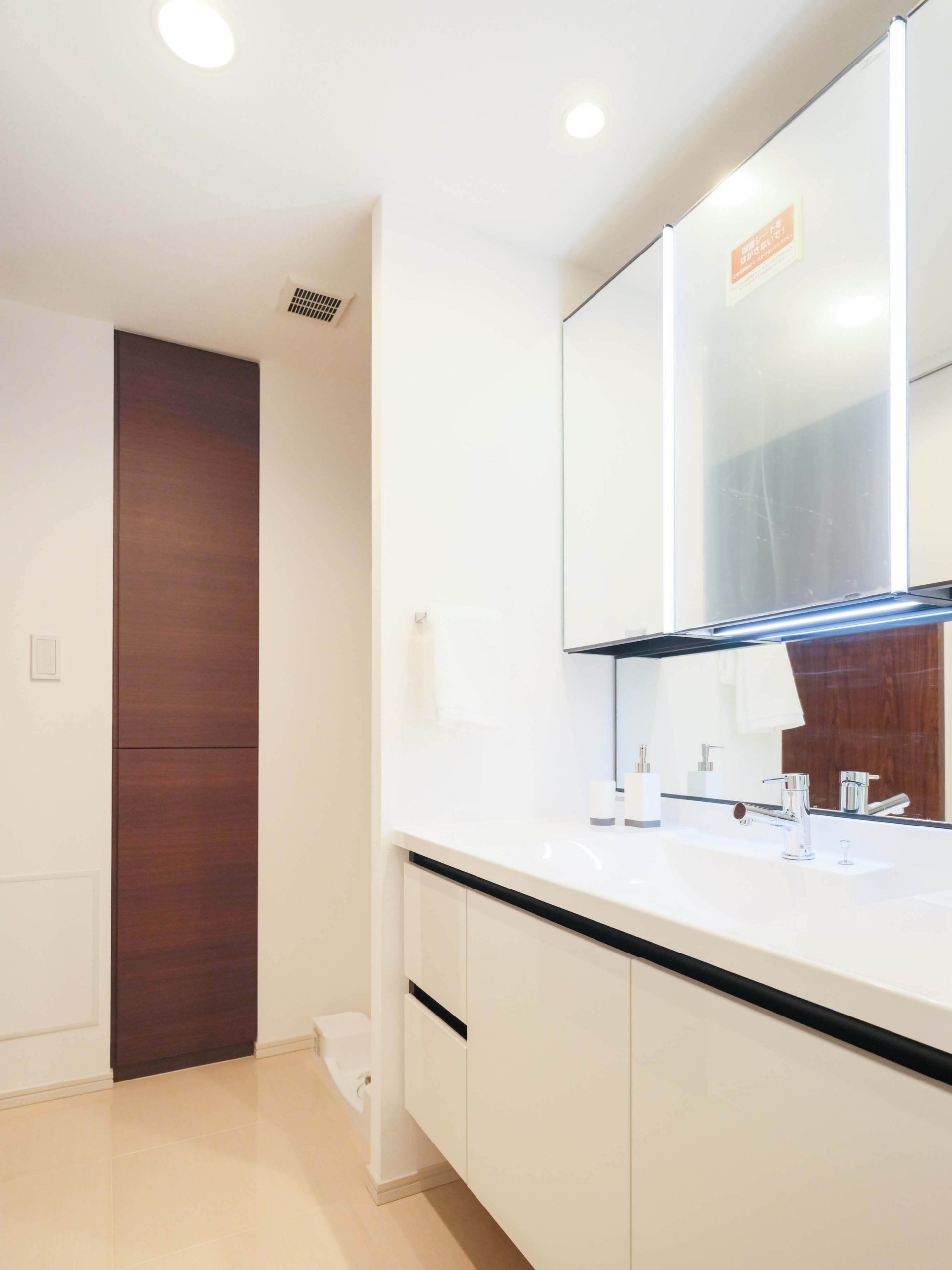 縦のライン照明が美しい洗面化粧台。洗面まわりの小物がすっきり整頓できるミラーボックス付きでいつでも整った状態をキープできそうですね。洗面台とは別途、リネン庫も備わっています。
