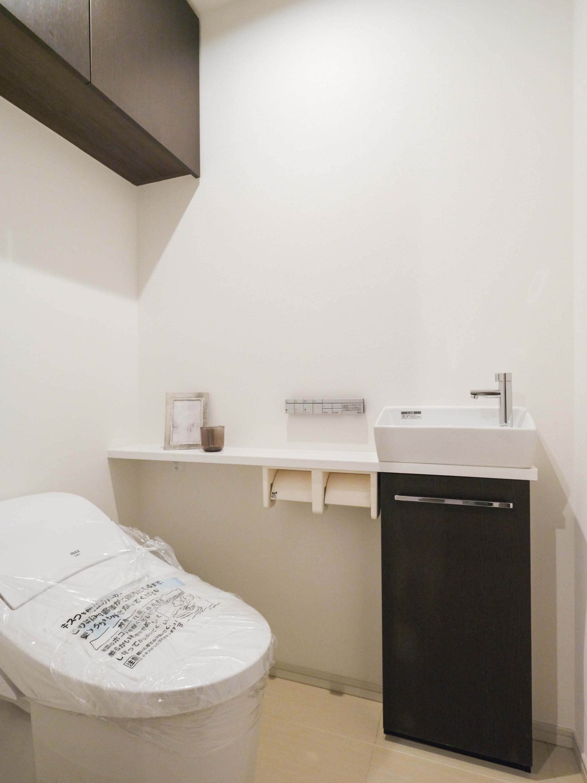 廊下に面したレストルーム。空間がすっきり見えるタンクレストイレです。独立型の手洗い器、2ロールのペーパーホルダー、ウォシュレット、収納スペースも備わっています。