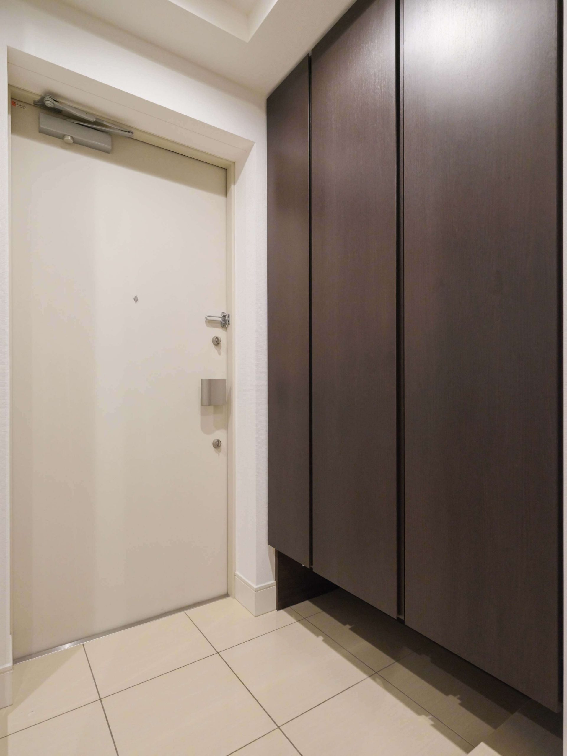 玄関には3枚扉のシューズボックスを完備。天井まで高さがあり、靴がたっぷりと収納できます。