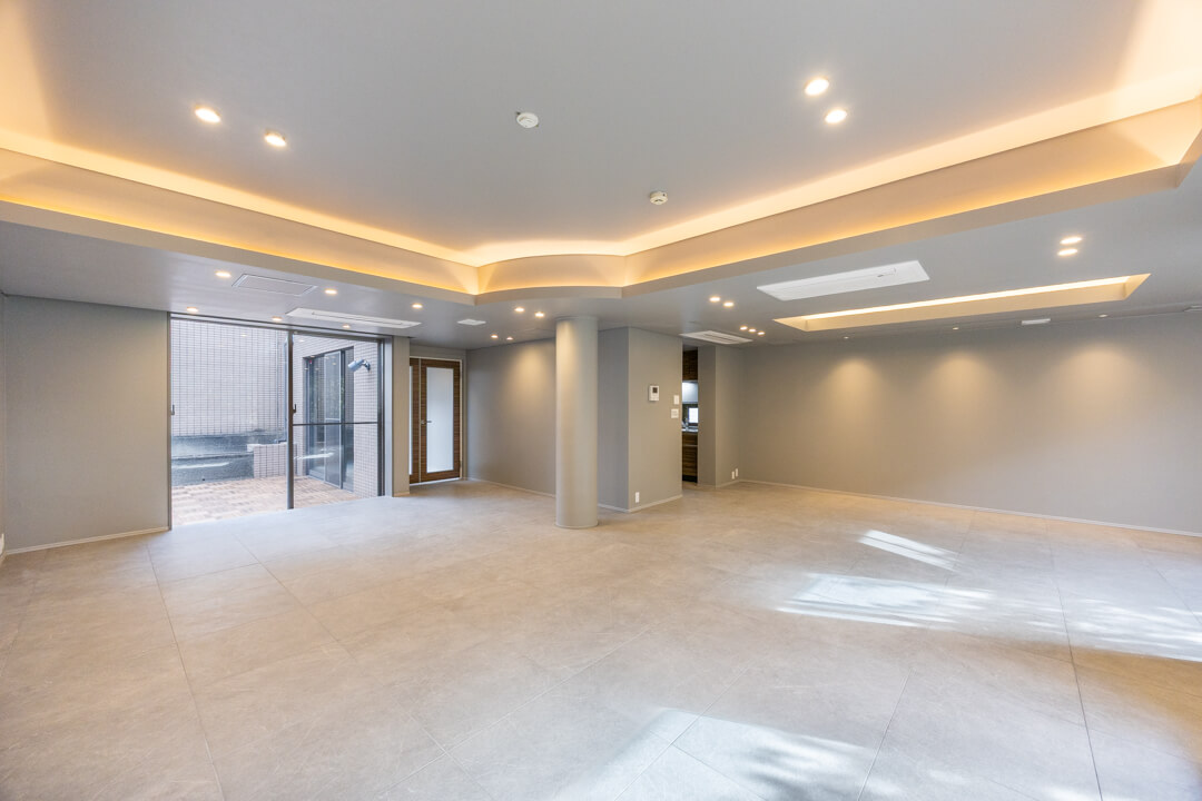 約36.2帖の広々としたリビングダイニングです。折り上げ天井には間接照明があしらわれていて、上品な雰囲気が漂っています。エアコンは埋め込み式のため、インテリアの邪魔にならないのも◎。また、二面採光で南向きのバルコニーに面しており、日当たりも良好です。