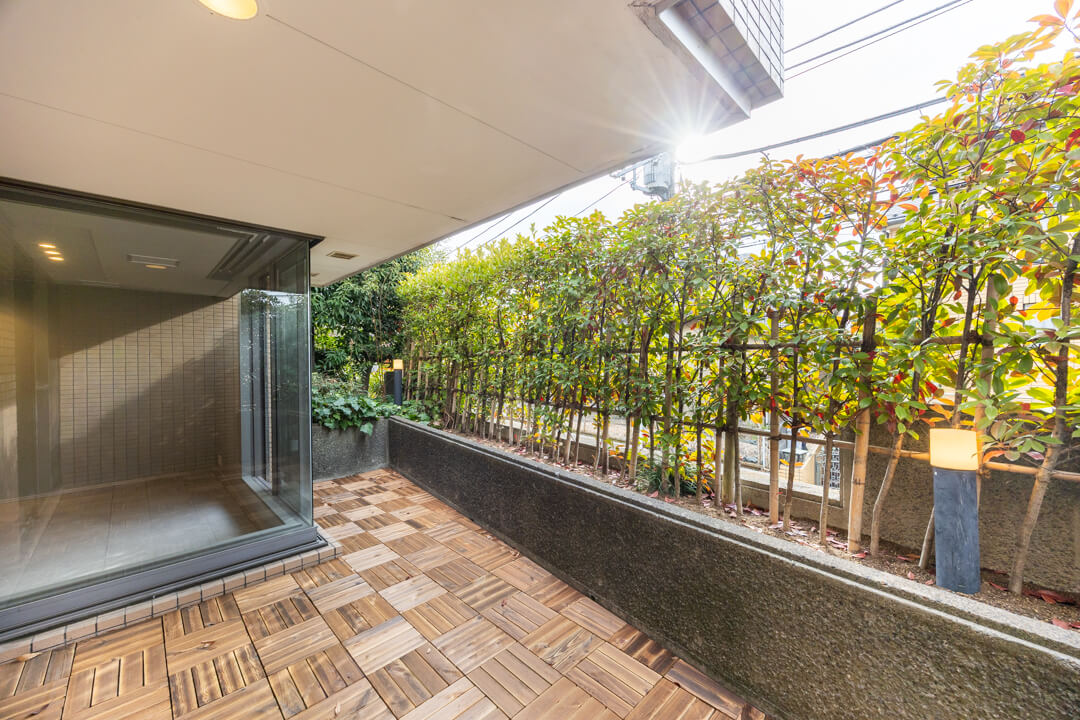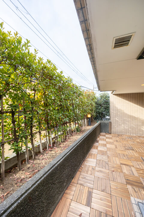 南向きのバルコニーです。日当たりが良好で気持ちの良い空間となっています。背の高い植栽のおかげで、外からの視線が気になりにくくなっているのも嬉しいですね。