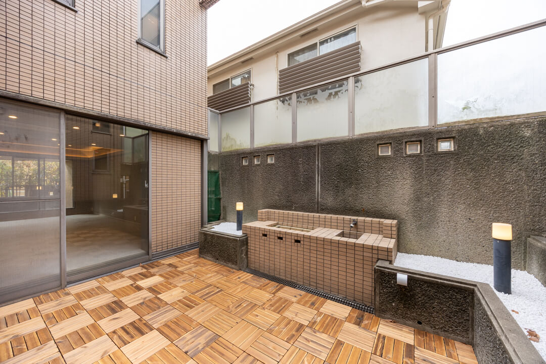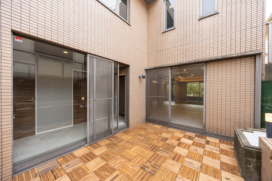 リビングダイニングからはBBQスペースにアクセスができます。外に面していないので、周りの目を気にせずに、家族や来客と楽しむことができますよ。蛇口も付いていて便利です。