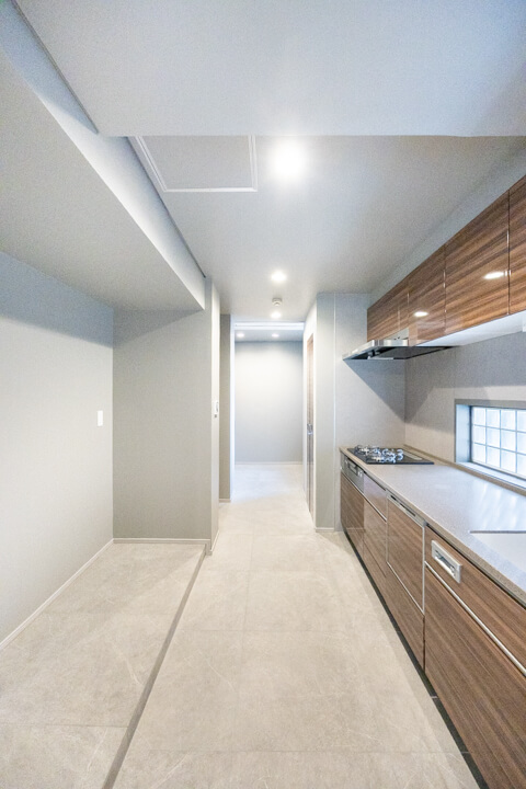 約6.2帖のキッチンは、生活感が出やすいキッチンまわりをさりげなく目隠しすることができる独立キッチンです。床暖房が設置されているので、冬場でも足元から温めてくれますよ。