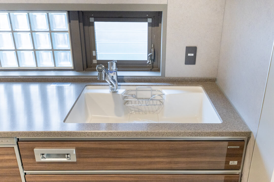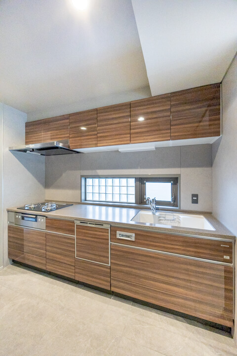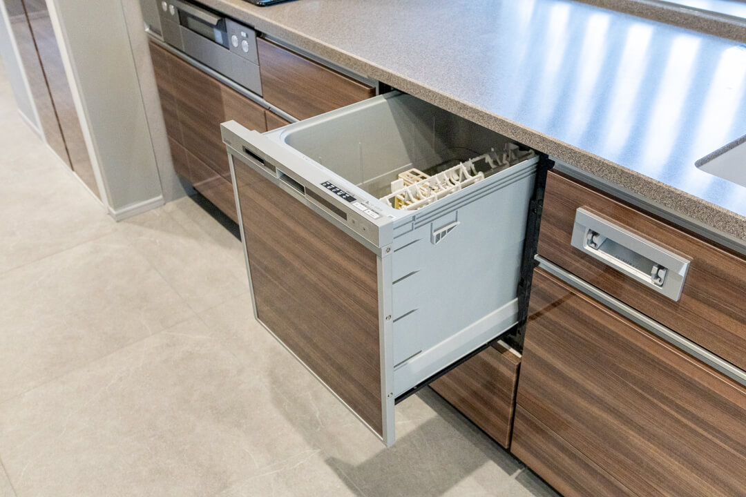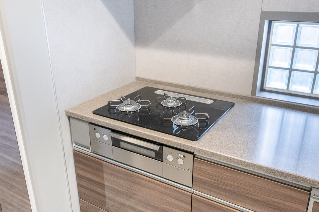 3口コンロ、グリル、食洗機付きと設備面も充実しています。シンクも広々としているので野菜などが洗いやすそうですよ。