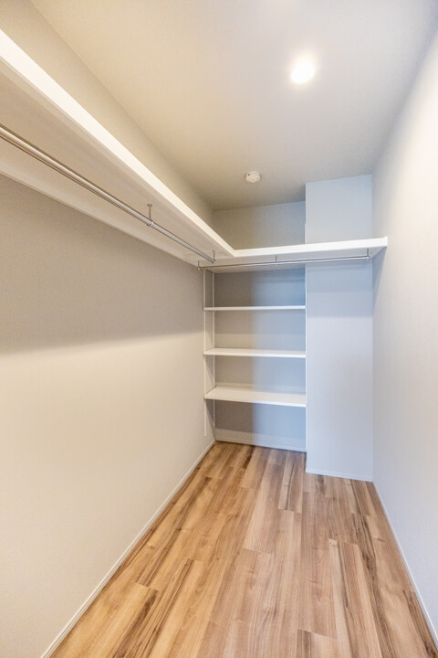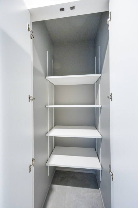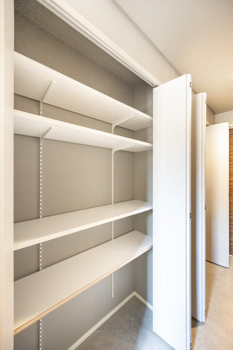 約4.3帖のパントリーが造られています。可動棚が設置されているので、収納したい物に合わせて調節が可能。また、キッチンからだけでなく、廊下からも出入りができる便利な動線になっているのも嬉しいポイントです。