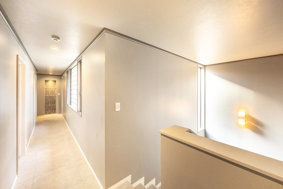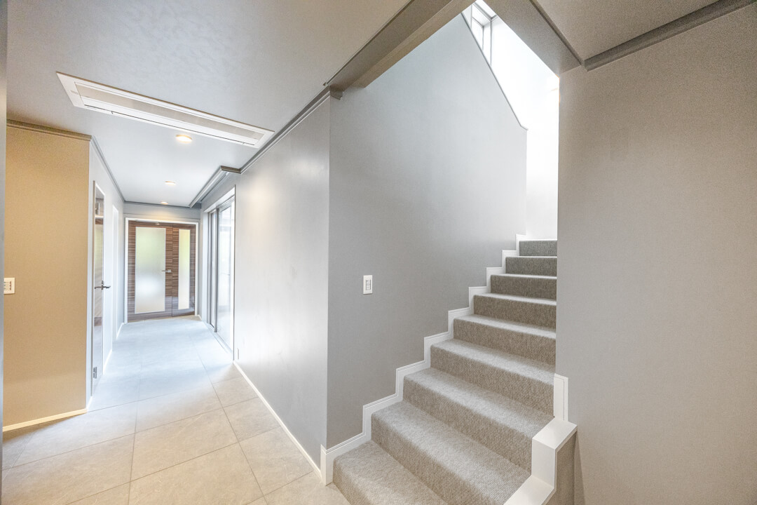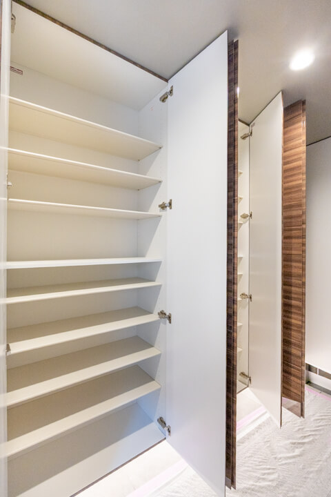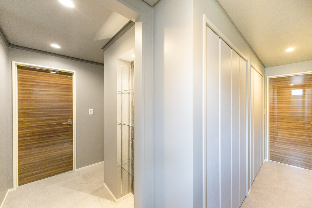 玄関には背の高いシューズボックスが備え付けられています。高さがありますが、フロートタイプのため空間に圧迫感を与えません。さらに、玄関収納や廊下収納もあって便利です。