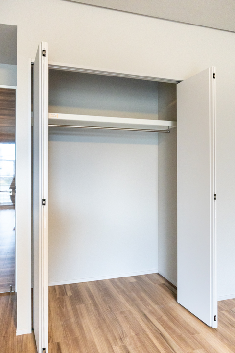 約14.7帖の広々とした寝室1は、主寝室に良さそうなお部屋です。壁面にはピクチャーレールが設置されているので、壁を傷つけずに絵画などを飾ることができますよ。また、約2.2帖のウォークインクローゼットにはパイプハンガーや可動棚が設置されているので、洋服や大きめの荷物だけでなく、小物も収納しやすくなっています。