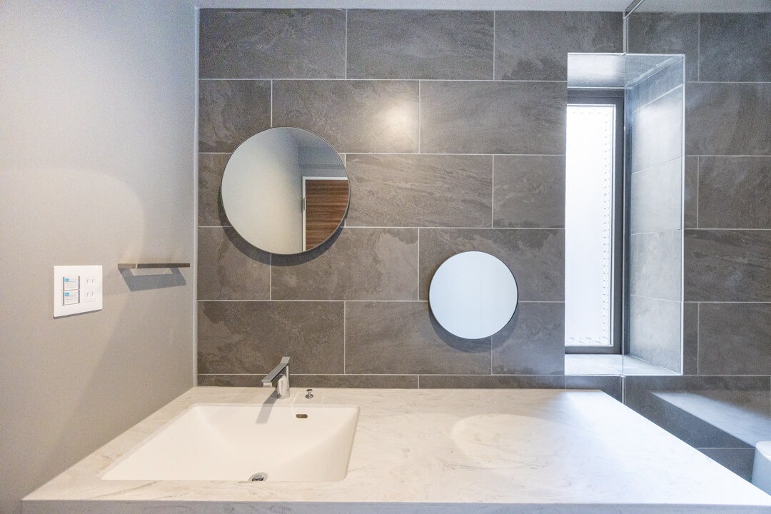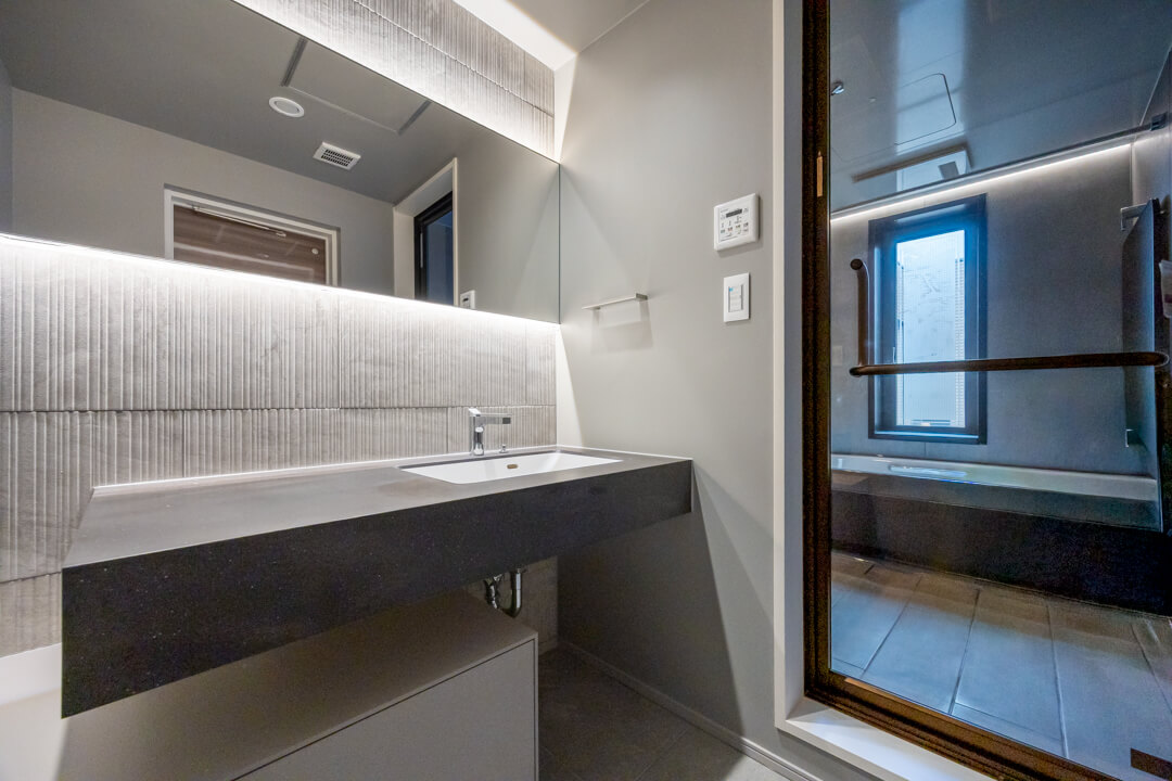 スタイリッシュな印象の洗面化粧台は、カウンターが広めで使い勝手良好。ワイドミラーなため、二人並んで使うこともできそうです。