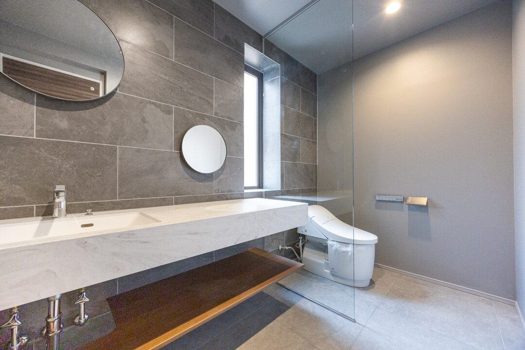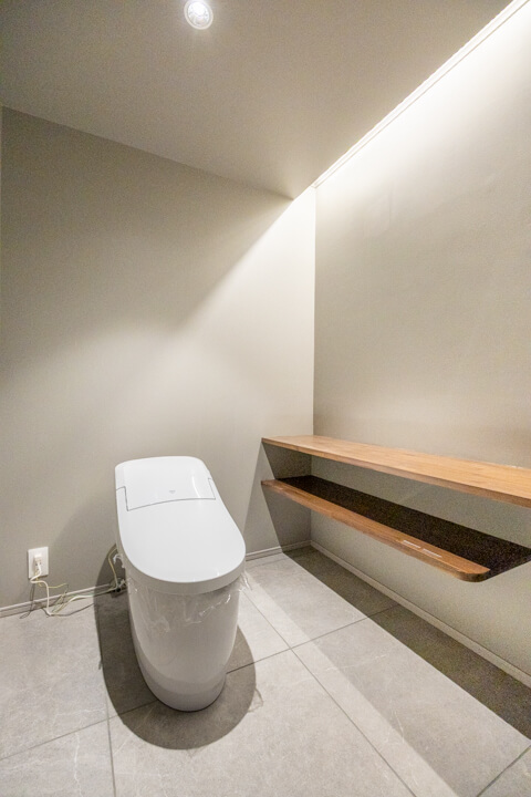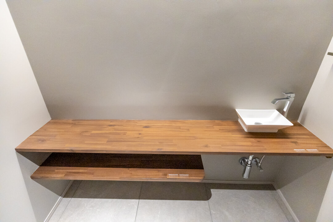 トイレは1Fと2Fの2ヶ所に造られています。来客用とプライベート用とで使い分けることができて便利。1Fには手洗い器、2Fには洗面化粧台が別途で設置されているので、その場でサッと身だしなみを整えることができます。