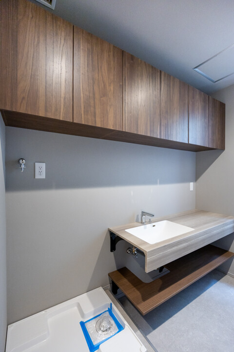 廊下には約6.7帖のユーティリティがあります。洗面化粧台や洗濯機置場、可動棚などが設置されていて、家事に便利なスペースとなっています。